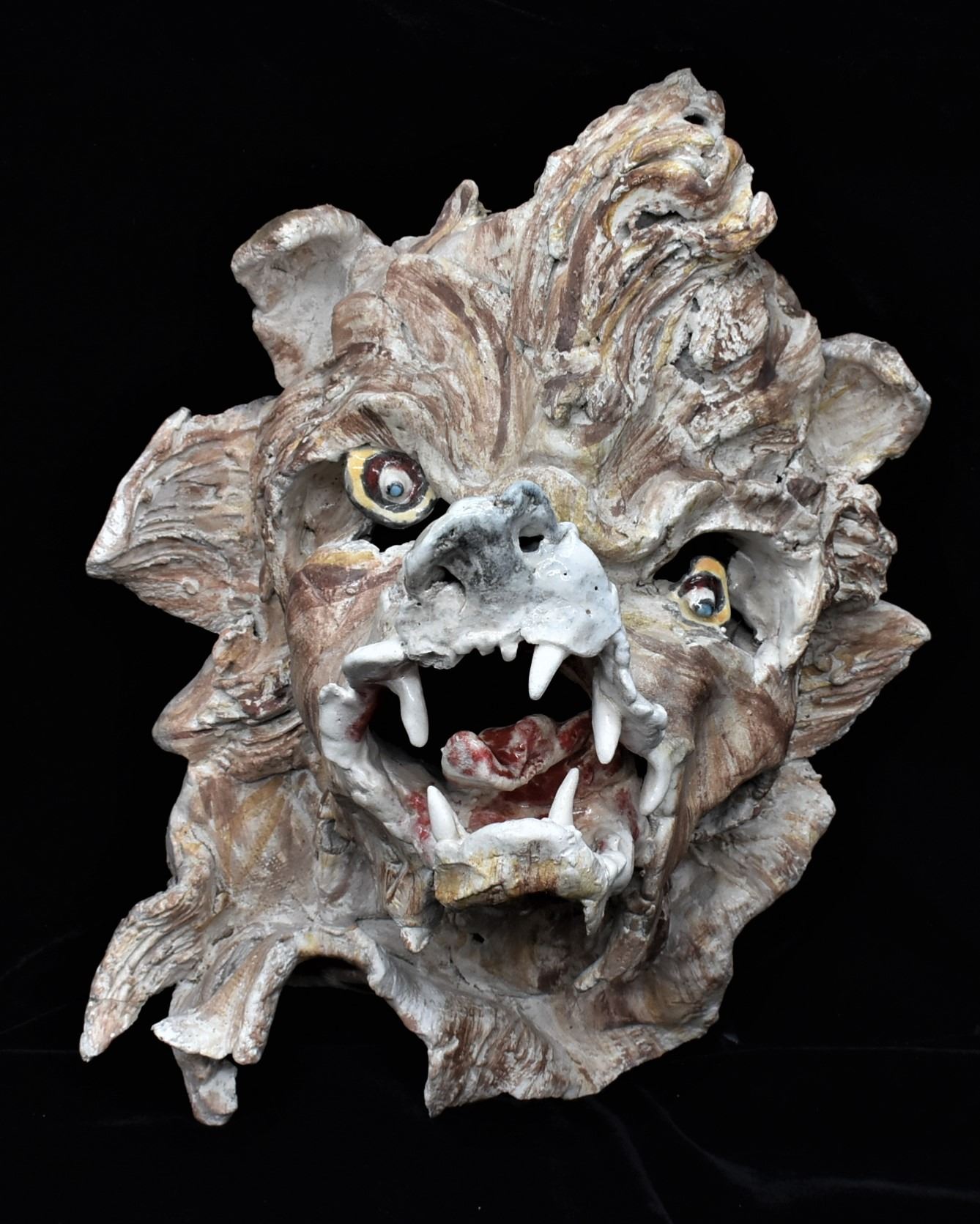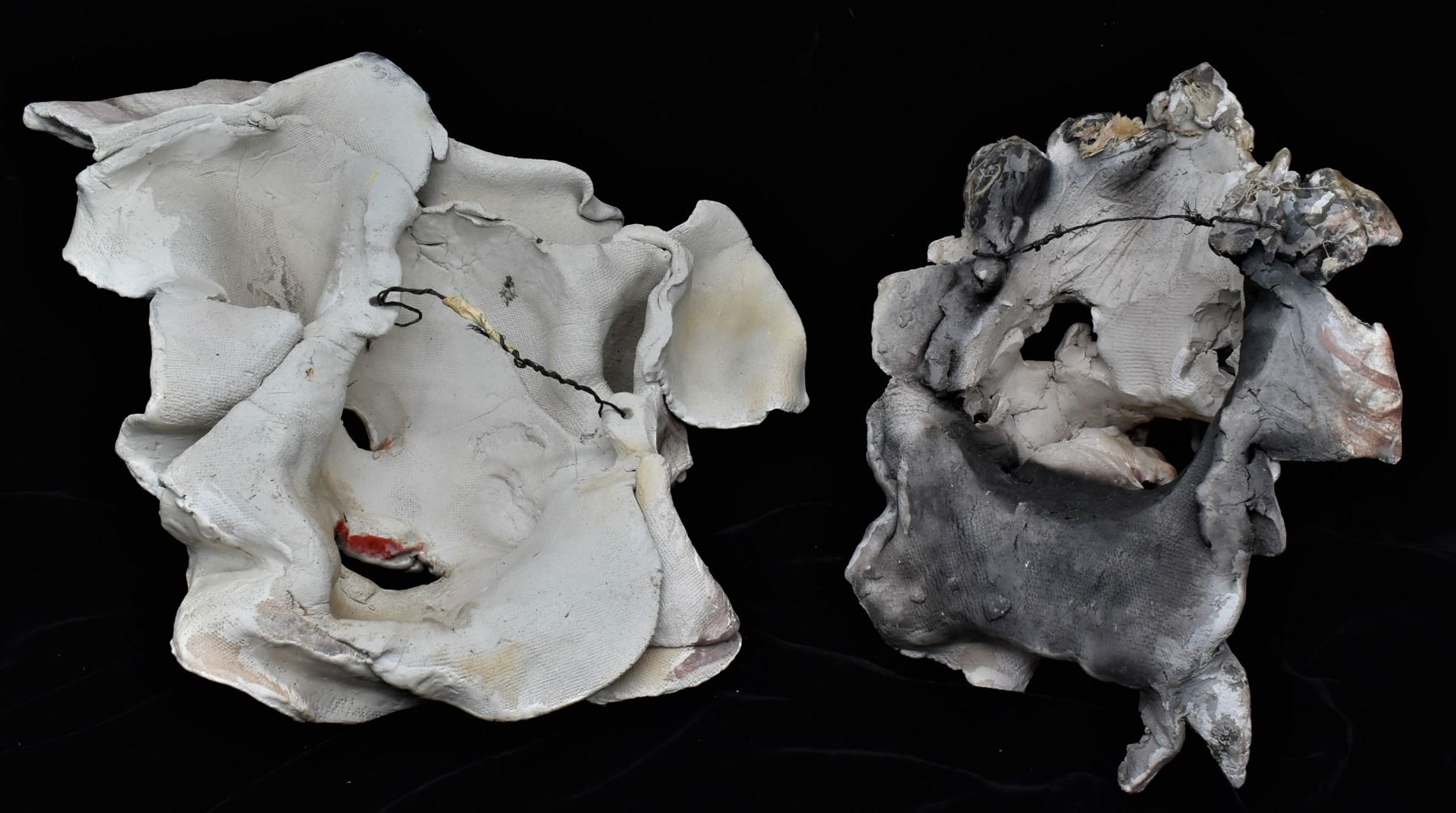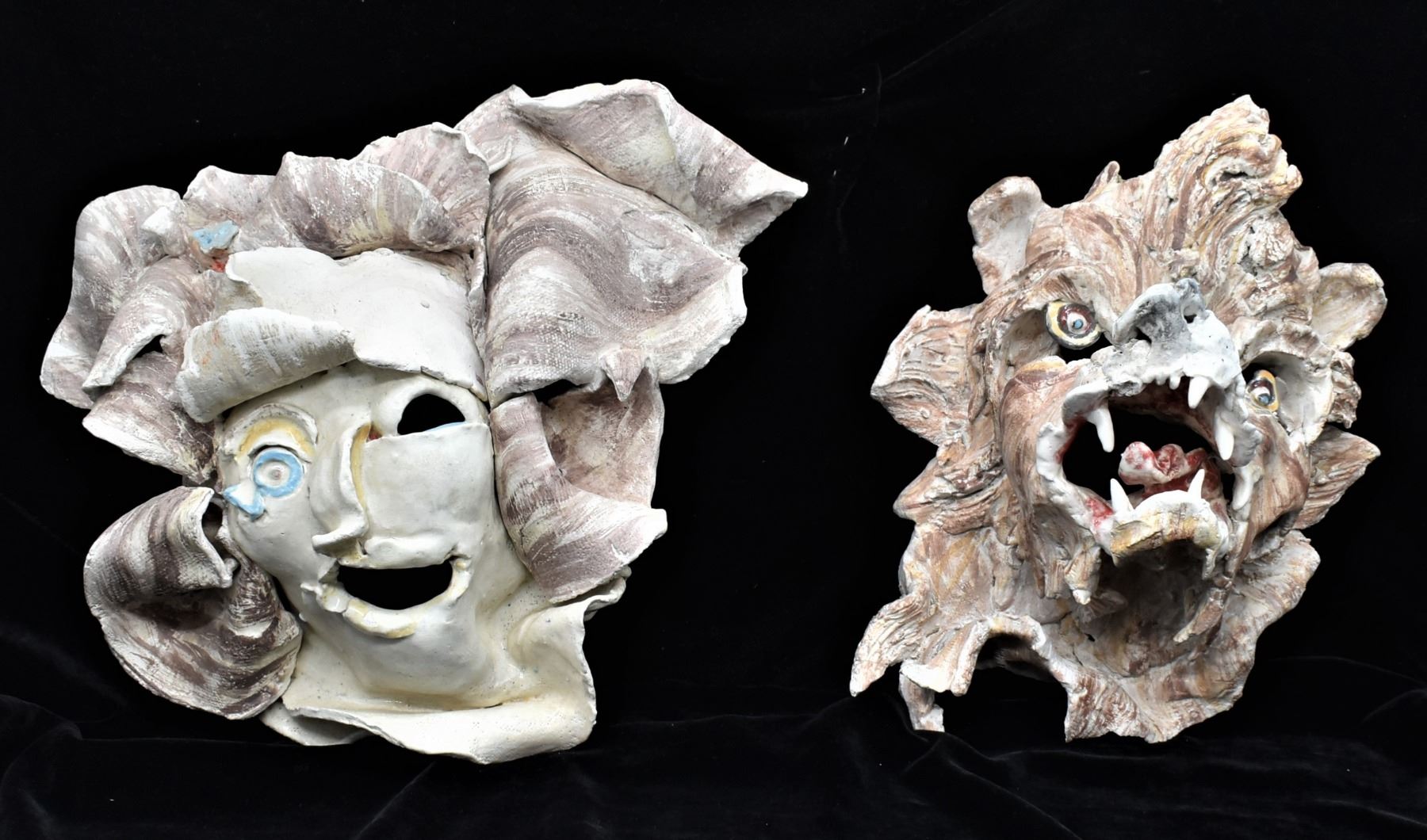 2 Original Slab Pottery Masks by Amelia Gianelli (1943-2019), largest mask measures 14'' x 12'' x 3.5'', the wolf is missing a canine tooth, FYI: ''Gianelli was a west coast artist who moved to Mimbres, NM. Her work is included in private and public collections including the Brooklyn museum in New York. Gianelli said she was ''captivated by the geography, sense of unlimited space and ambient light of the Southwest . . . She felt that her environment strongly influenced the way she approached her work.''
