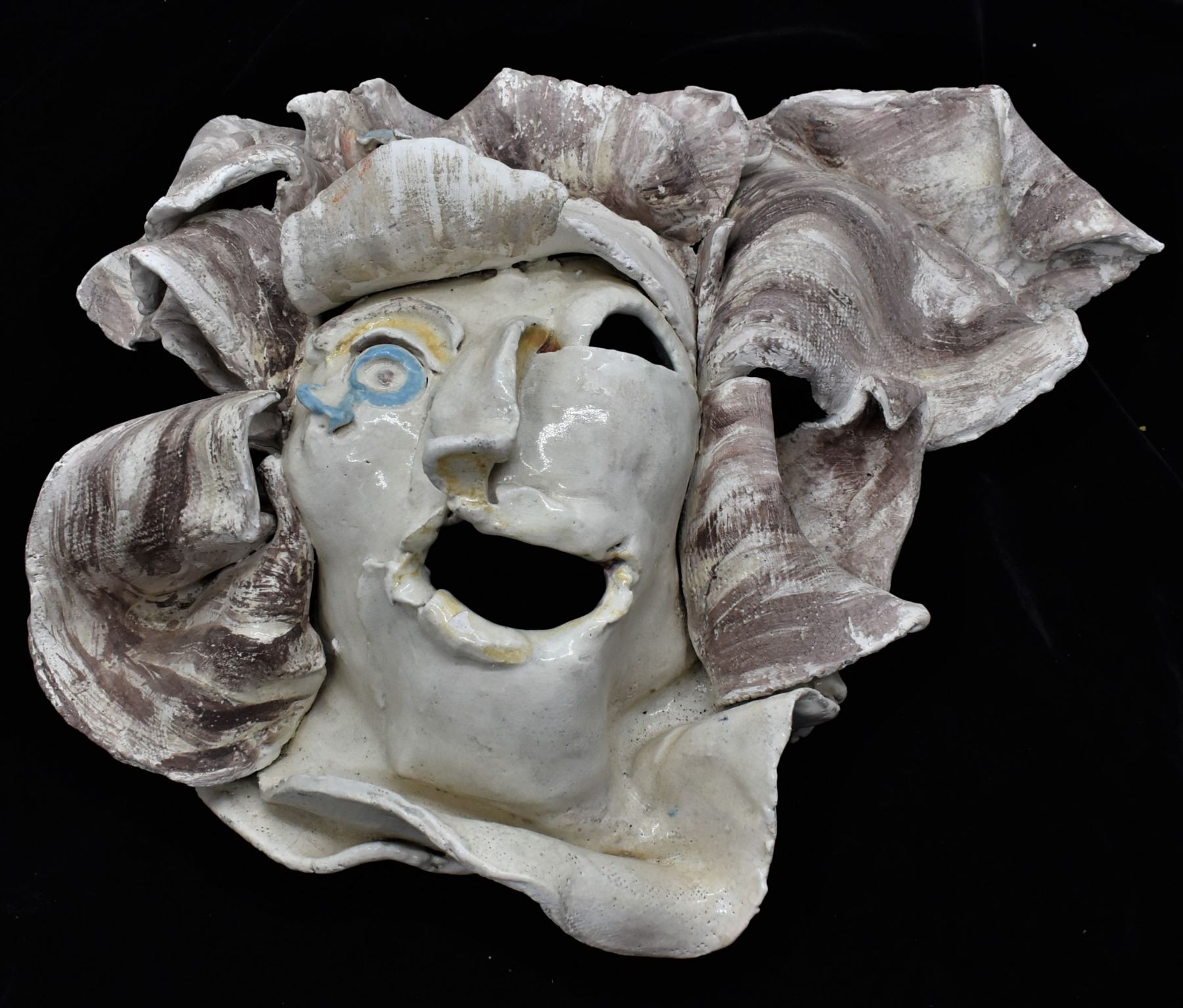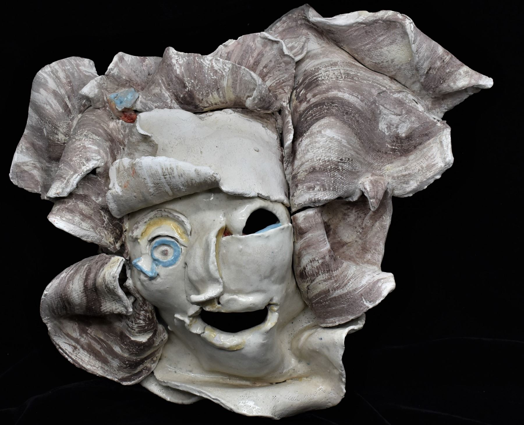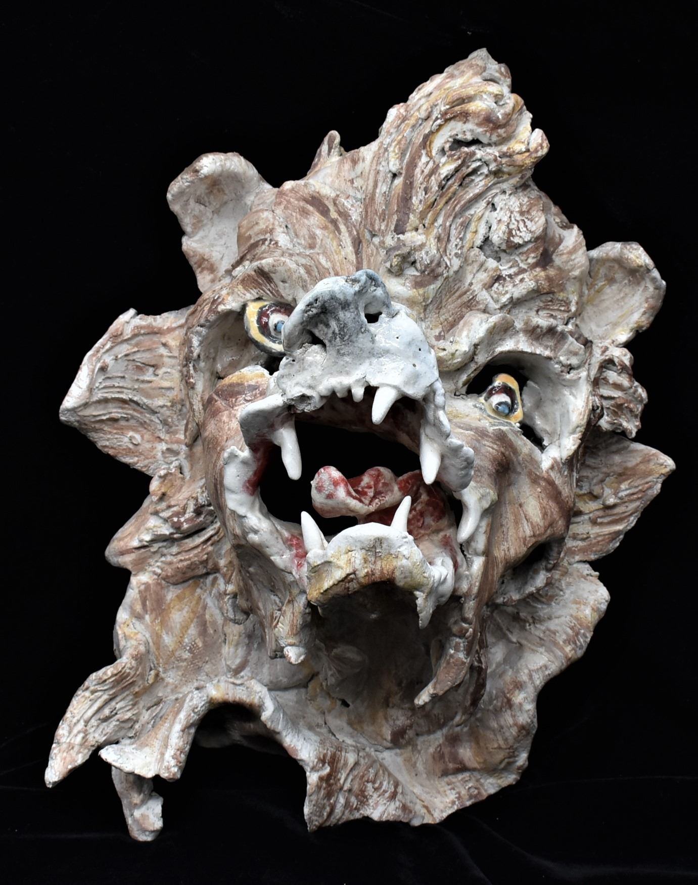 2 Original Slab Pottery Masks by Amelia Gianelli (1943-2019), largest mask measures 14'' x 12'' x 3.5'', the wolf is missing a canine tooth, FYI: ''Gianelli was a west coast artist who moved to Mimbres, NM. Her work is included in private and public collections including the Brooklyn museum in New York. Gianelli said she was ''captivated by the geography, sense of unlimited space and ambient light of the Southwest . . . She felt that her environment strongly influenced the way she approached her work.''