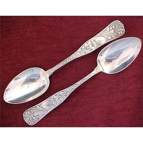 This is a pair of simply stunning 6 7/8" long sterling oval bowled soup, dessert or place spoons are in a wonderful Victorian pattern that features an ornate design of leaved and hibiscus flowers. The backs are plain, and the only mark is sterling. These spoons are in wonderful condition with light L monogram. Shipping to US addresses is $5.
