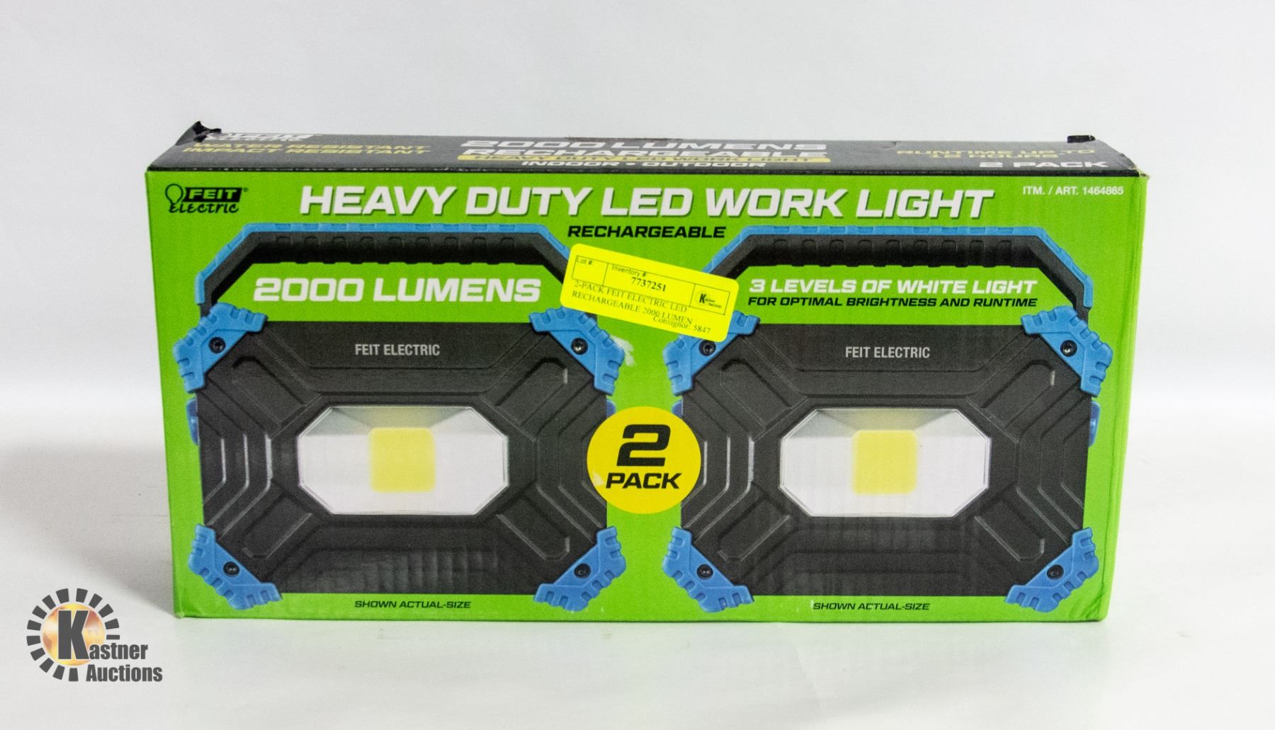 WORK LIGHT RECHARGEABLE EXTRA BRIGHT 2,000/1,000/500 LUMEN BEAM. HEAVY DUTY MAGNETIC HANDLE AND HOOK FOR HANDS-FREE USE. WATER AND IMPACT RESISTANT. INCLUDES BATTERY INDICATOR LIGHT AND USB OUTPUT FOR USE AS AN EMERGENCY POWER BANK