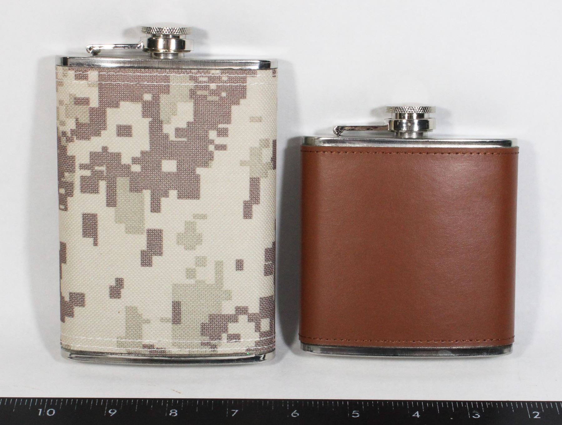 2 PACK LIQUOR FLASK.1 CAMO 8 OZ AND 1 GENUINE LEATHER WRAPPED 60 Z.