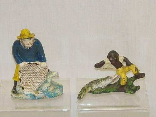 2 PAINTED CAST IRON BOTTLE OPENERS - FISHERMAN and COMIC BLACK CHARACTER - WEAR;