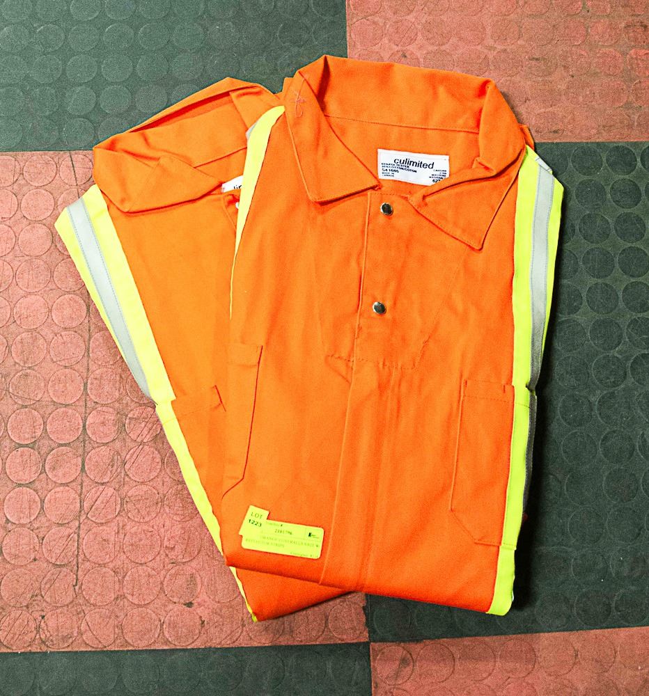2 PAIR ORANGE COVERALLS S:62T W/ REFLECTOR STRIPS