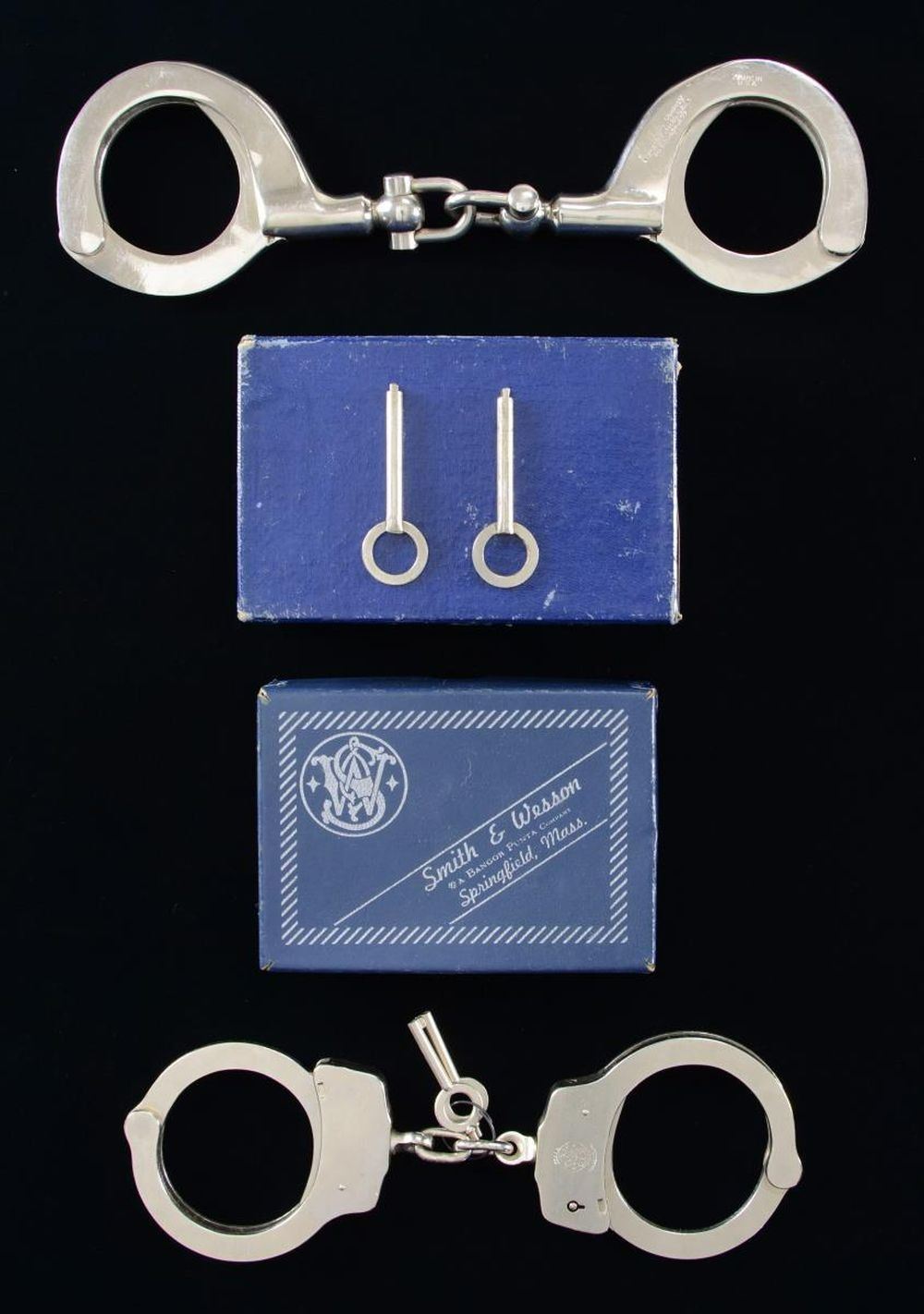1) SMITH & WESSON MODEL 90 NICKEL REGULARD FINISH HANDCUFFS. Comes with box & keys. 2) HARRINGTON & RICHARDSON NO. 123 NICKEL SUPER HANDCUFFS. Comes with box & key. CONDITION. handcuffs in good to very good condition with light wear. Boxes good to very good with some tears. (02-21084/MD). $200-400.