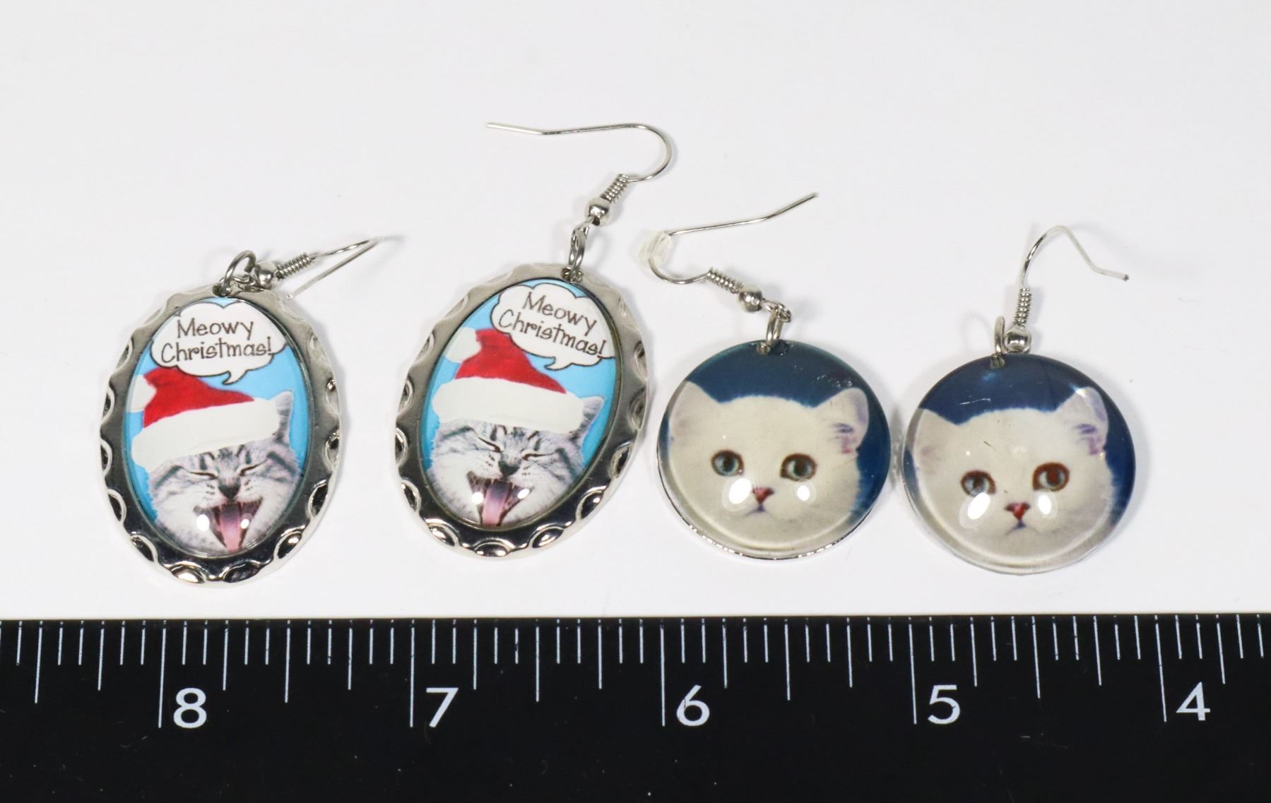 2 PAIRS OF SILVER TONE CAT THEME DROP EARRINGS