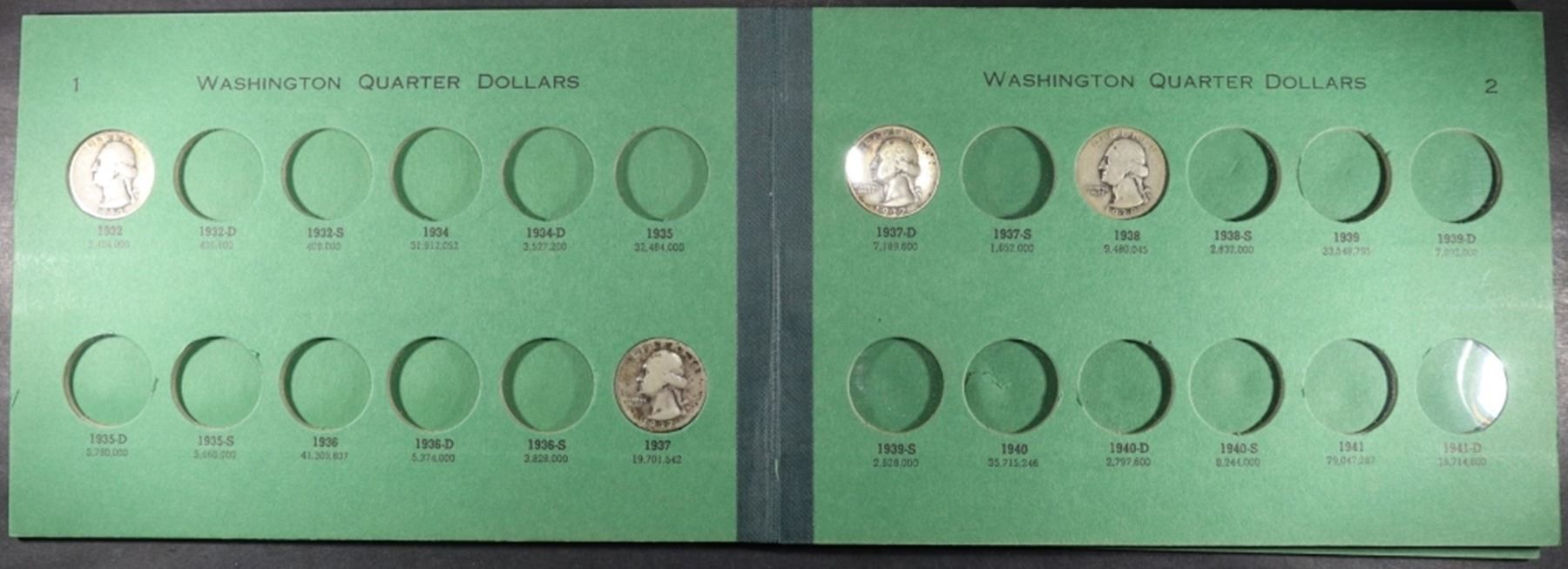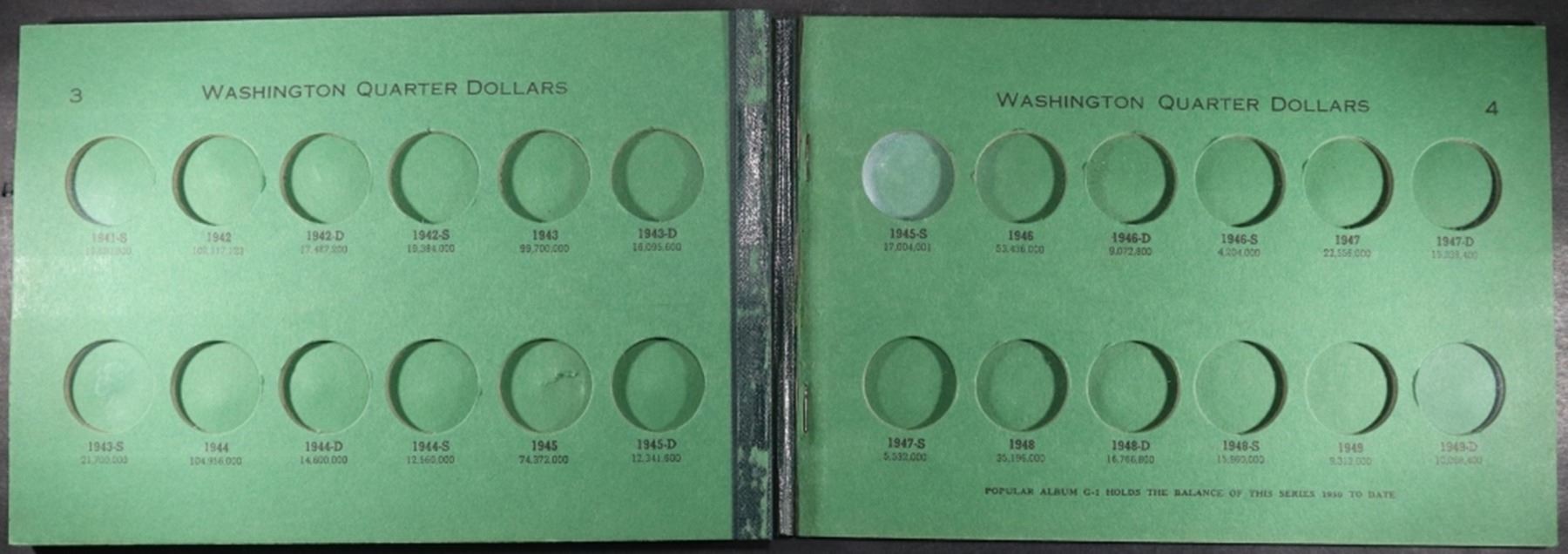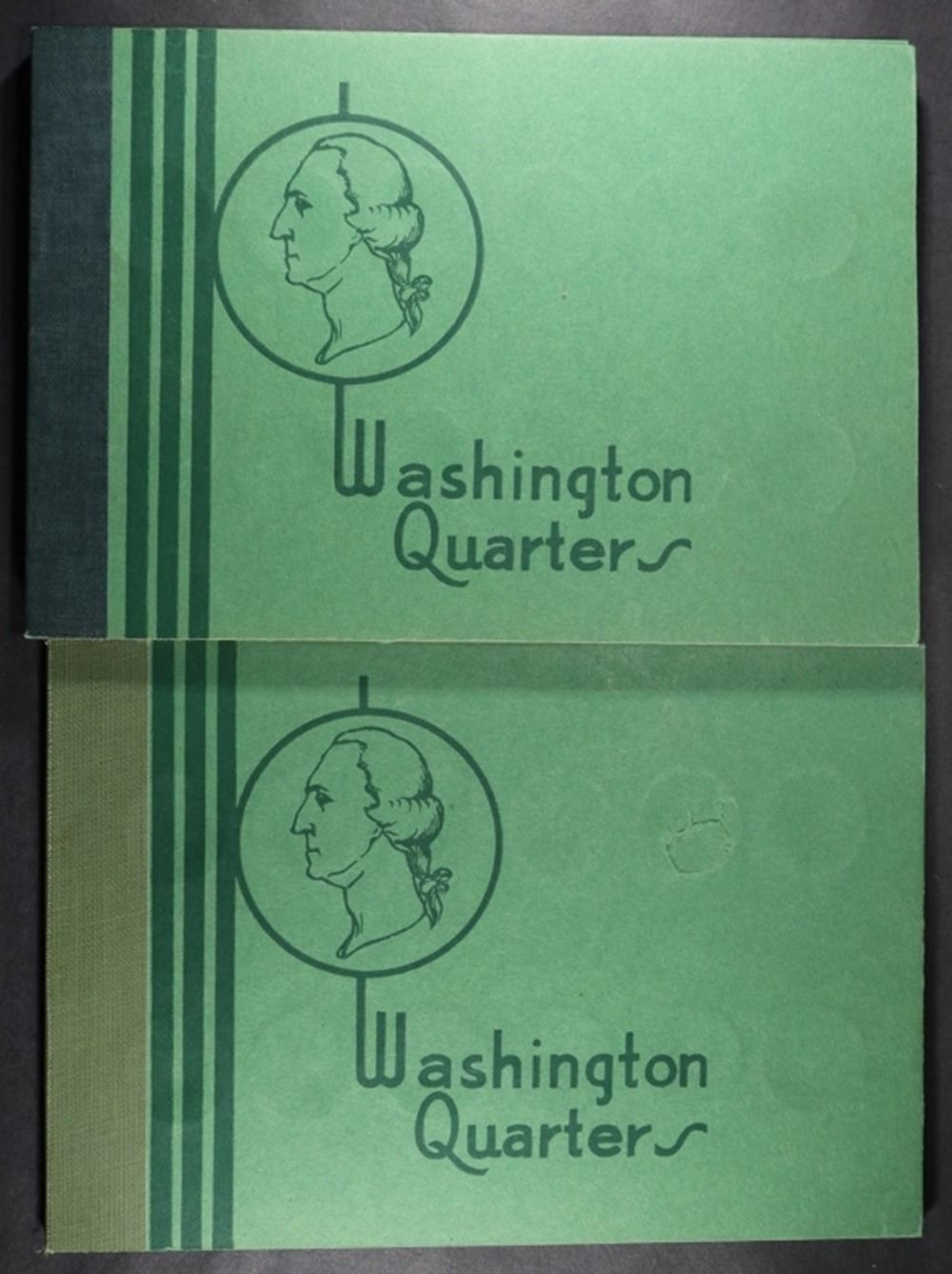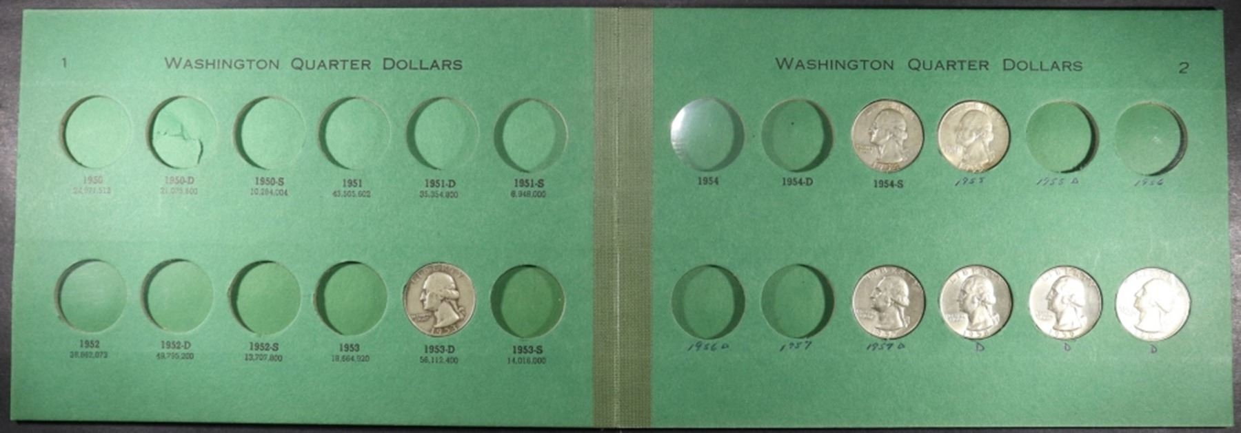 (1) WASHINGTON QUARTERS (DATES RANGE: 1932-1949) MISSING 44 COINS, (1) WASHINGTON QUARTERS (DATES RANGE: 1950-1954) MISSING 13 COINS, (5) ADDITIONAL COINS INCLUDED ESTIMATE $100 - $150.