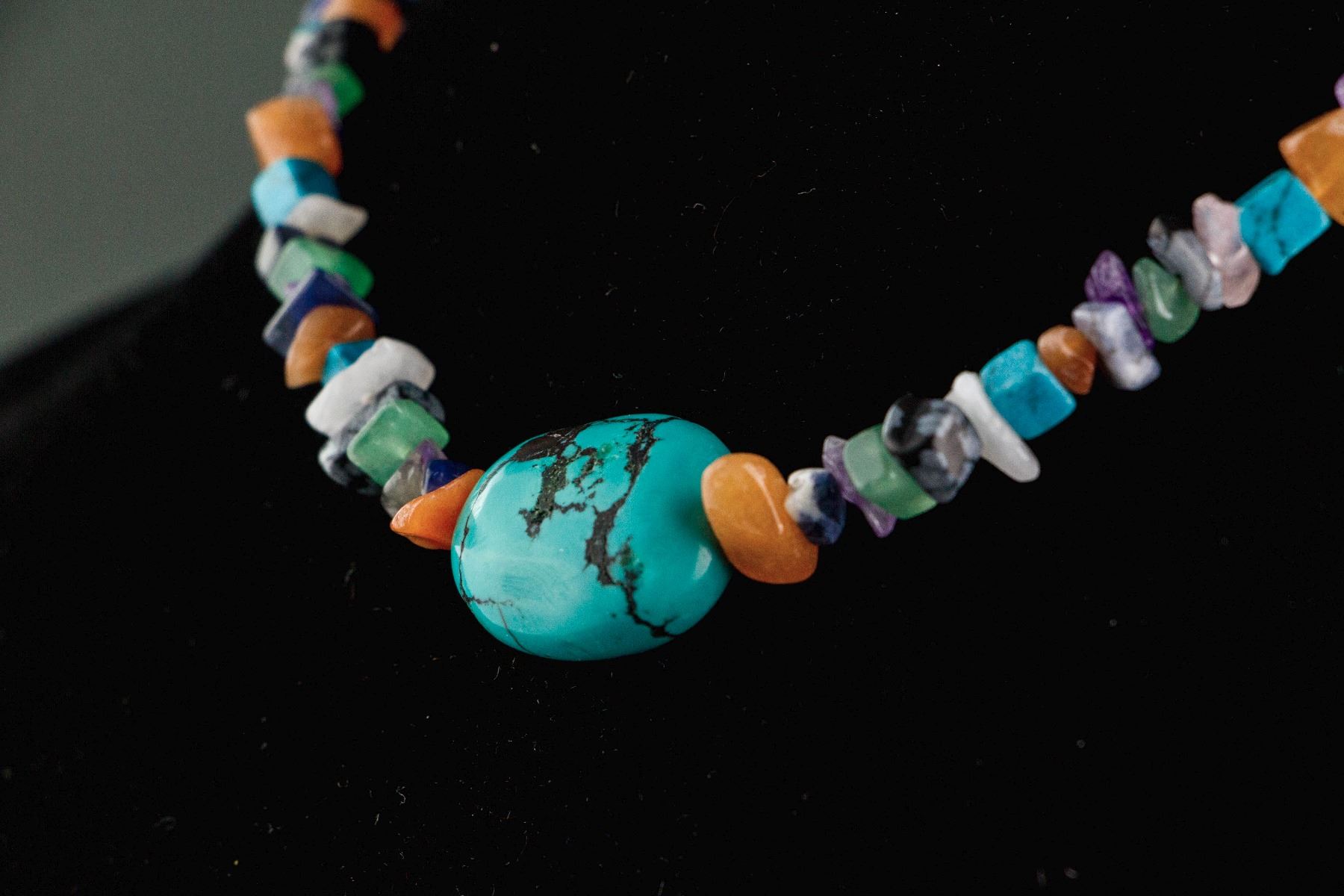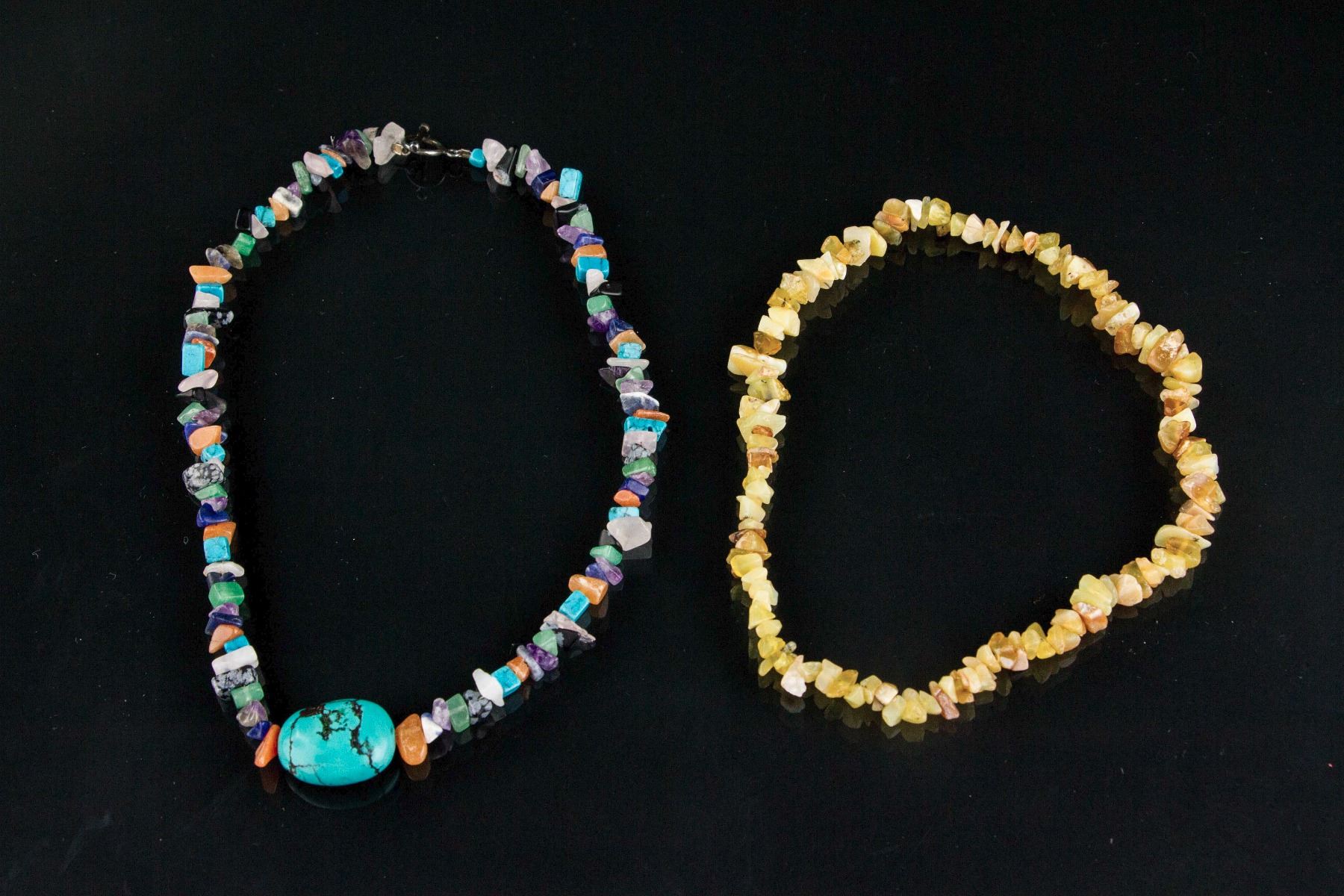 Two pieces of Chinese necklace; one of a yellow hardstone necklace; one of assorted stone beads necklace with big ovoid beads in middle; D: 19.5 cm, W: 1 cm, 29 grams (1/2), D: 17.5 cm, W: 1.5 cm, 19 grams (2/2)