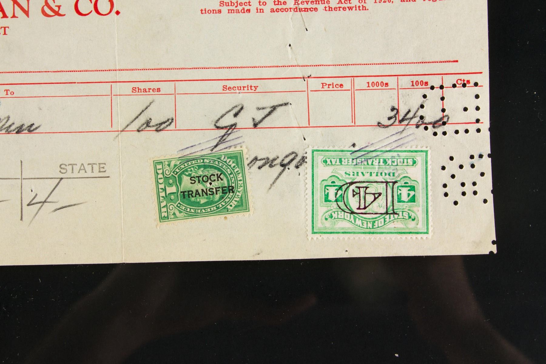 2 pieces of assorted United States stamp; of 1 1917 Documentary 1 dollar stamp with Stock Transfer mark; 1 State of New York 4 dollar stock transfer stamp; with J & W Seligman $ Co. stock invoice; 10 cm x 22.5 cm