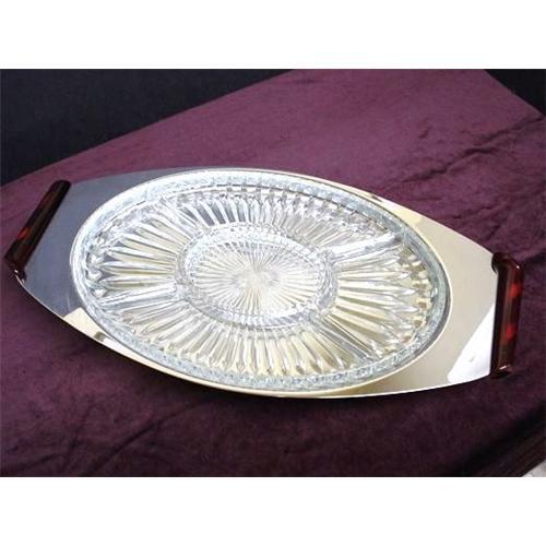 </font></strong>BEAUTIFUL 1950's OVAL CHROME DISH WITH BEAUTIFUL HEAVY, PRESSED GLASS LINER, THIS DISH IS ADORNED WITH LOVELY CHERRY COLOR BAKELITE HANDLES AND 4 BAKELITE FEET - as per images - STYLED BY GLO-HILL,FOR GOURMETES, MADE IN CANADA, Excellent gently,used condition, Measuring about - from handle to handle 18 inch long x 9 1/2" wide,and 2 1/4 inch high, READY TO DISPLAY AND USE, US Buyer to pay 12.00 (very heavy)for shipping plus insurance.THANKS.</font>