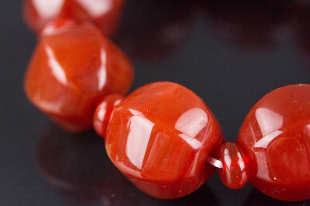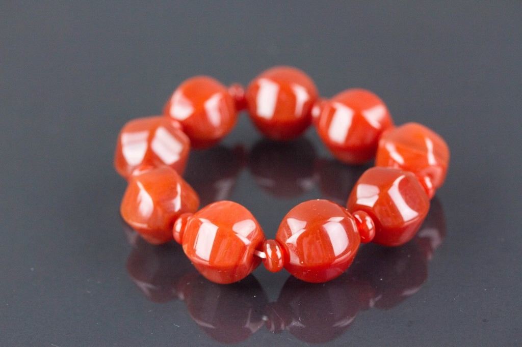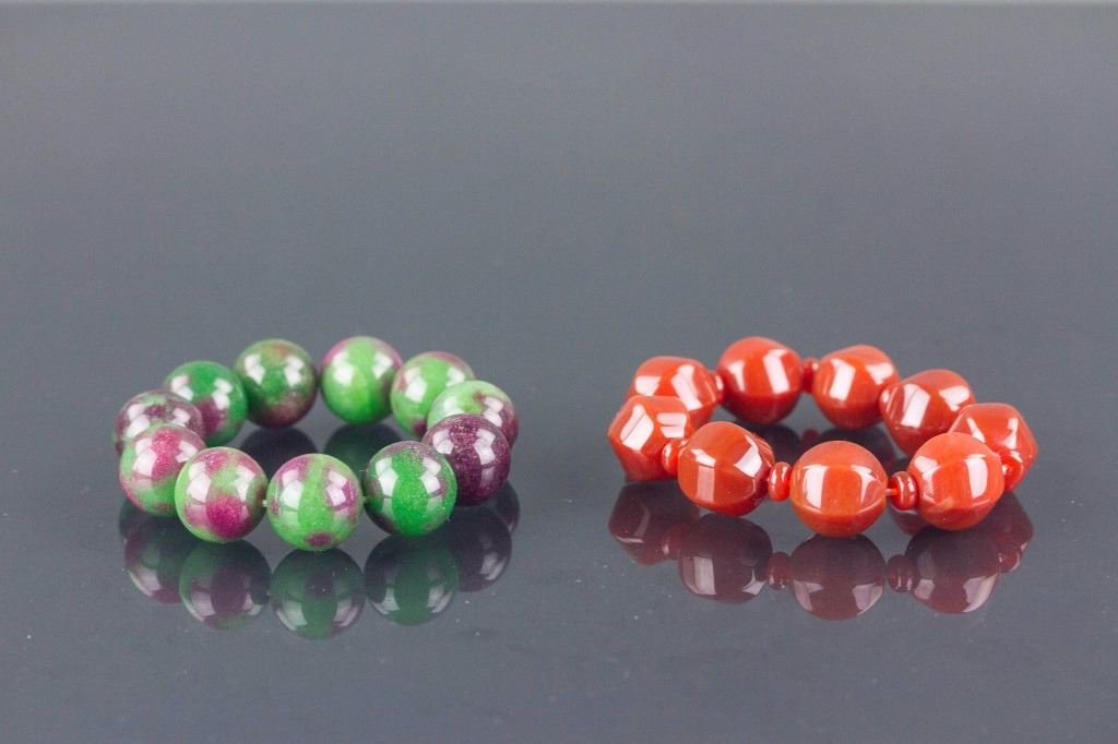Two pieces of Chinese agate and hardstone carved bracelet; one comprised of round hardstone beads, of mixed green and purple tone; one comprised of lobed agate beads, of red tone; D: 6 cm, 217 grams