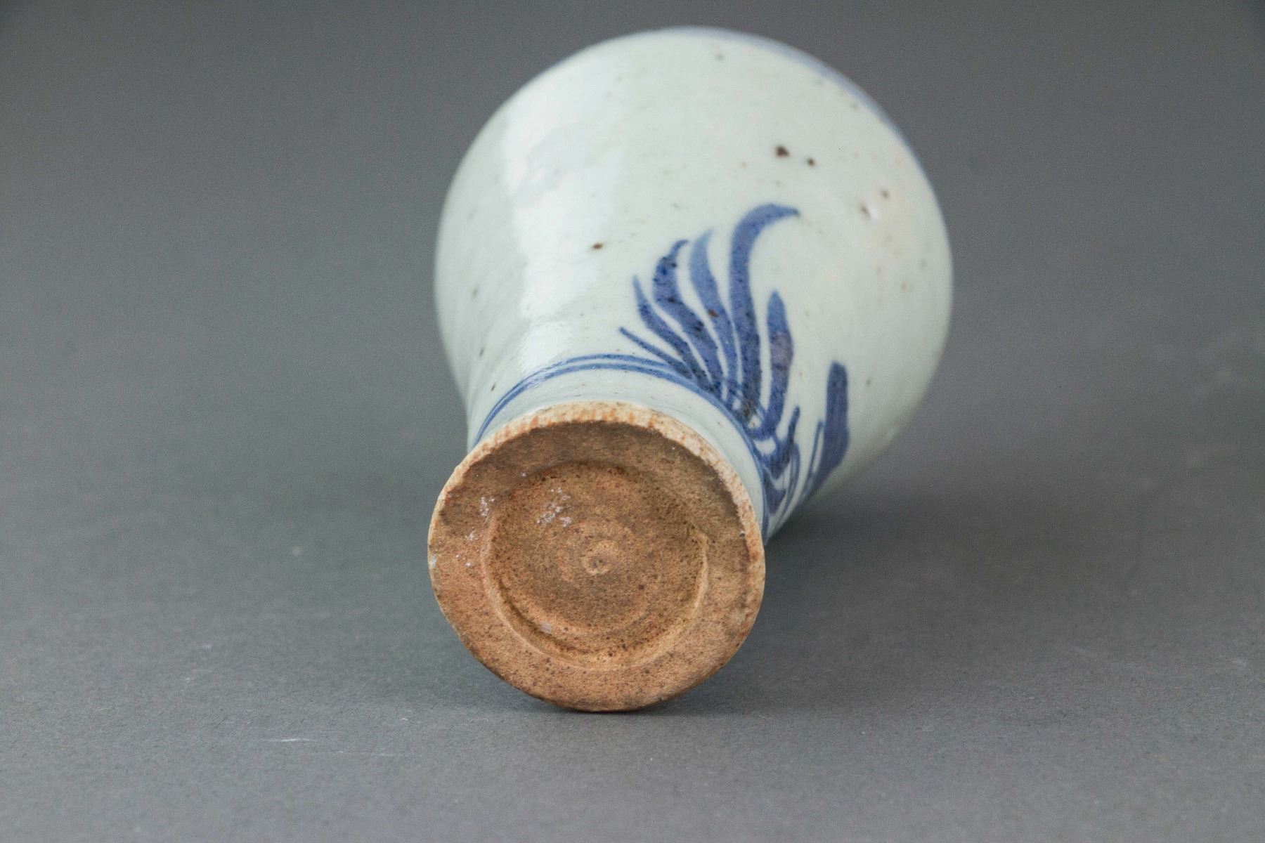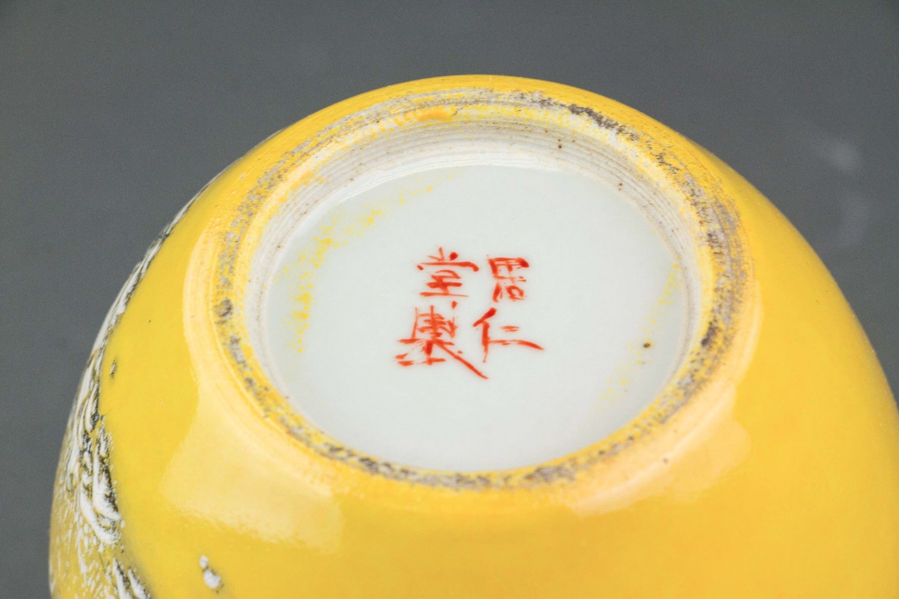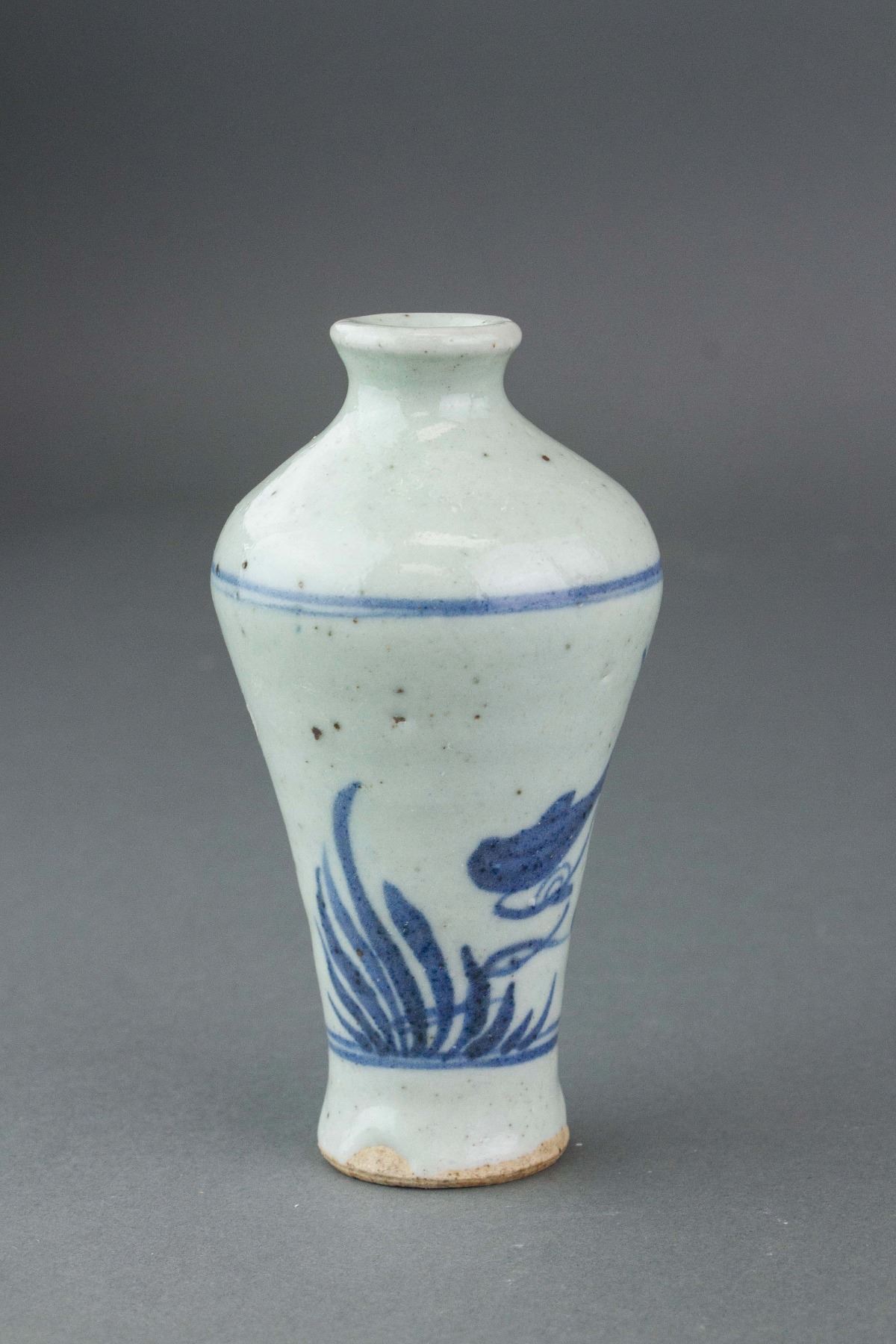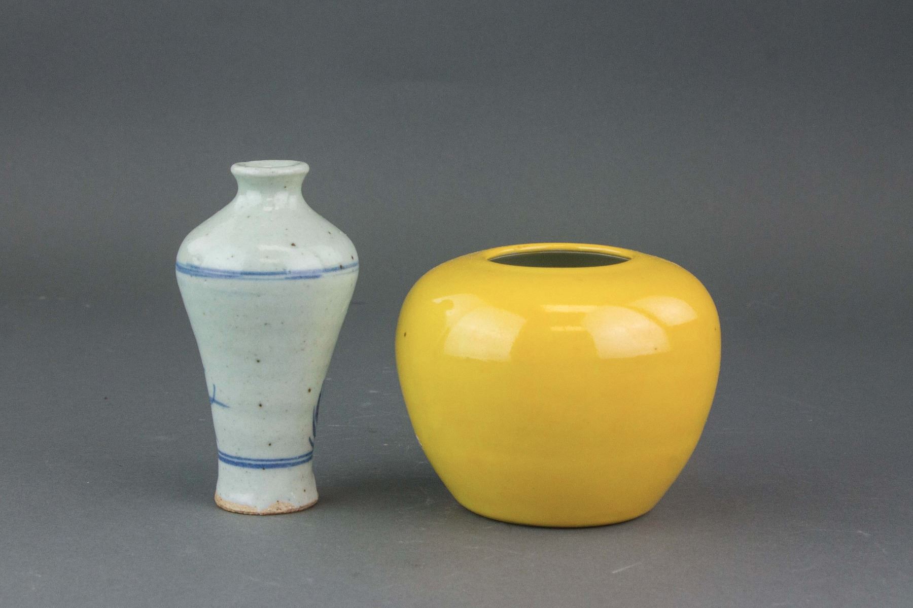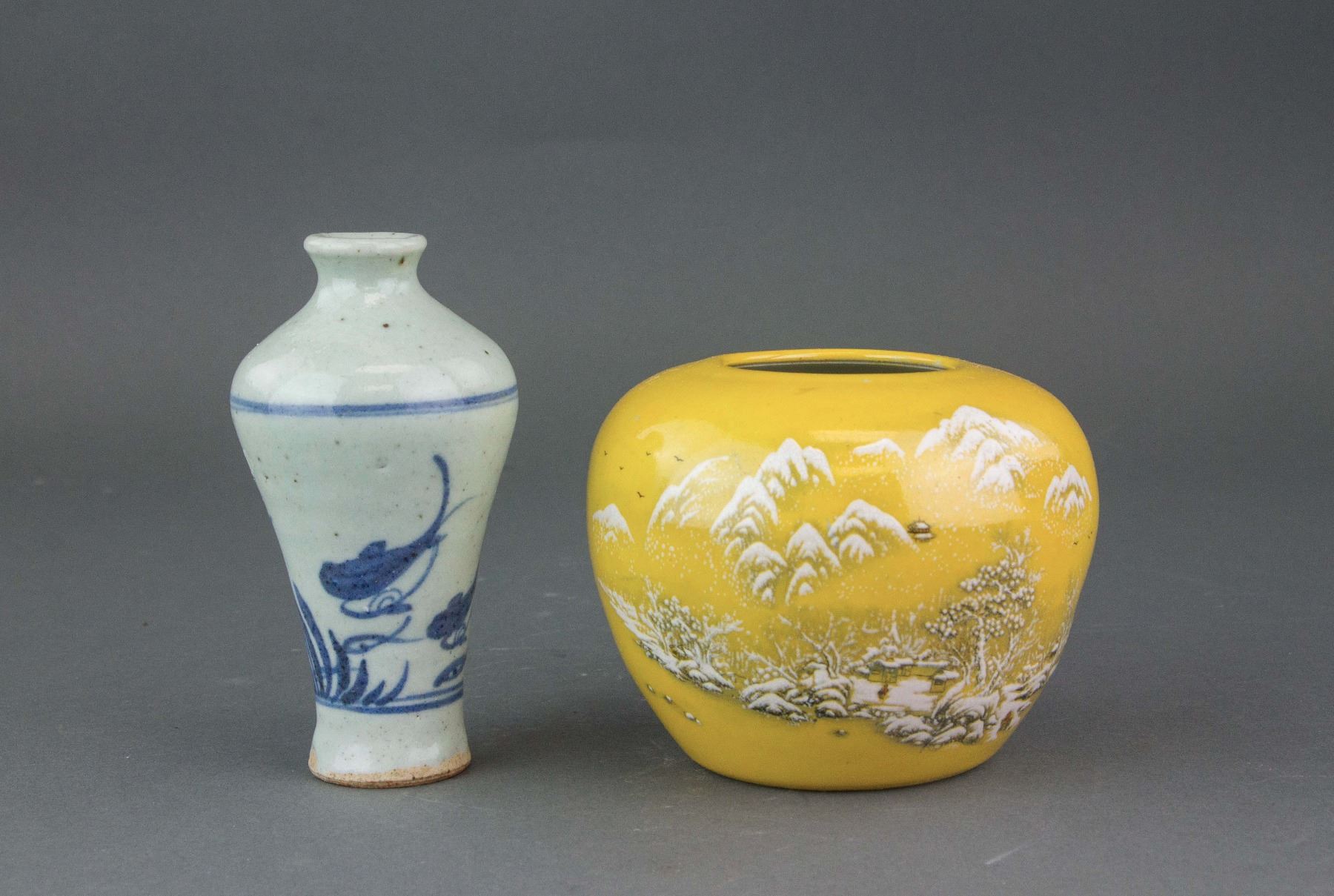 2 pieces Chinese porcelain vase and jar; one of blue and white porcelain vase, of Meiping vase form; painted with fish and water grass; one of yellow glazed jar, decorated with landscape painting; H: 8 cm, 11 cm, D: 10 cm, 6 cm, 388 grams (total)