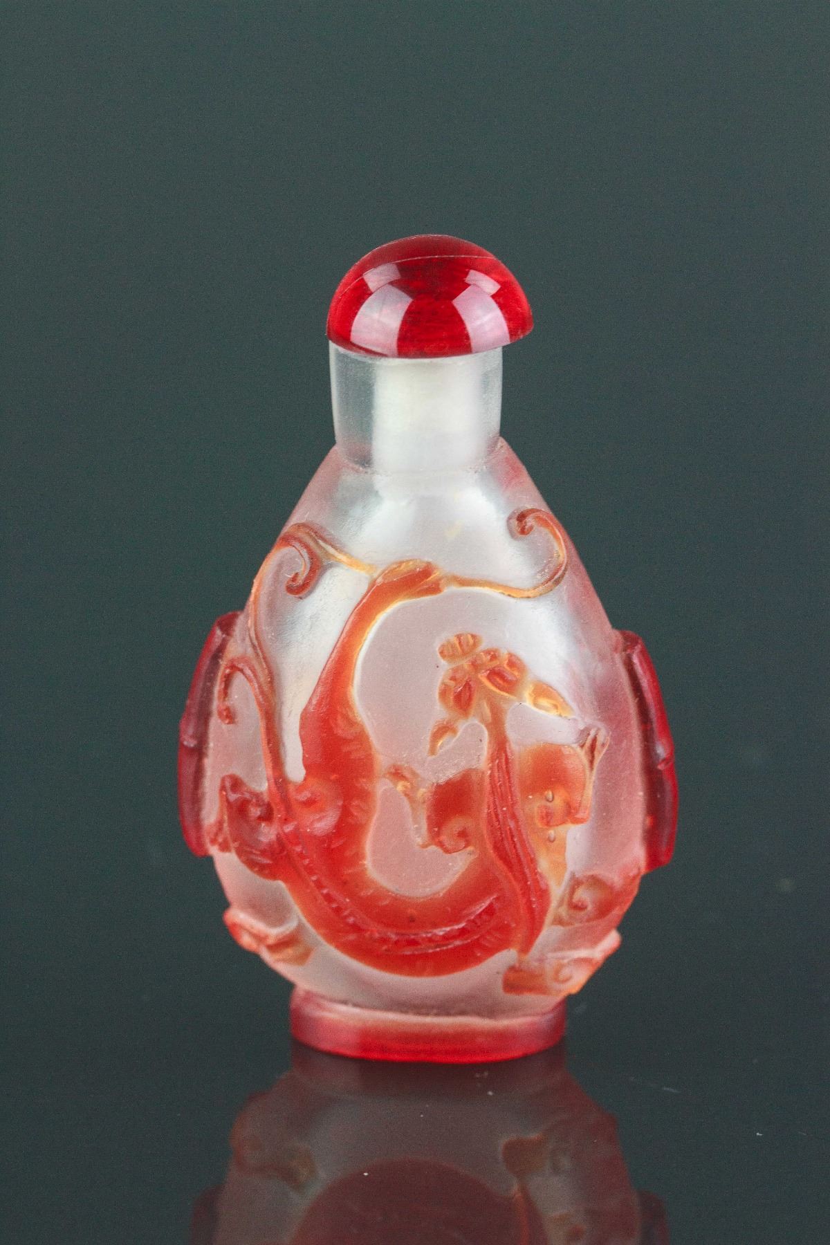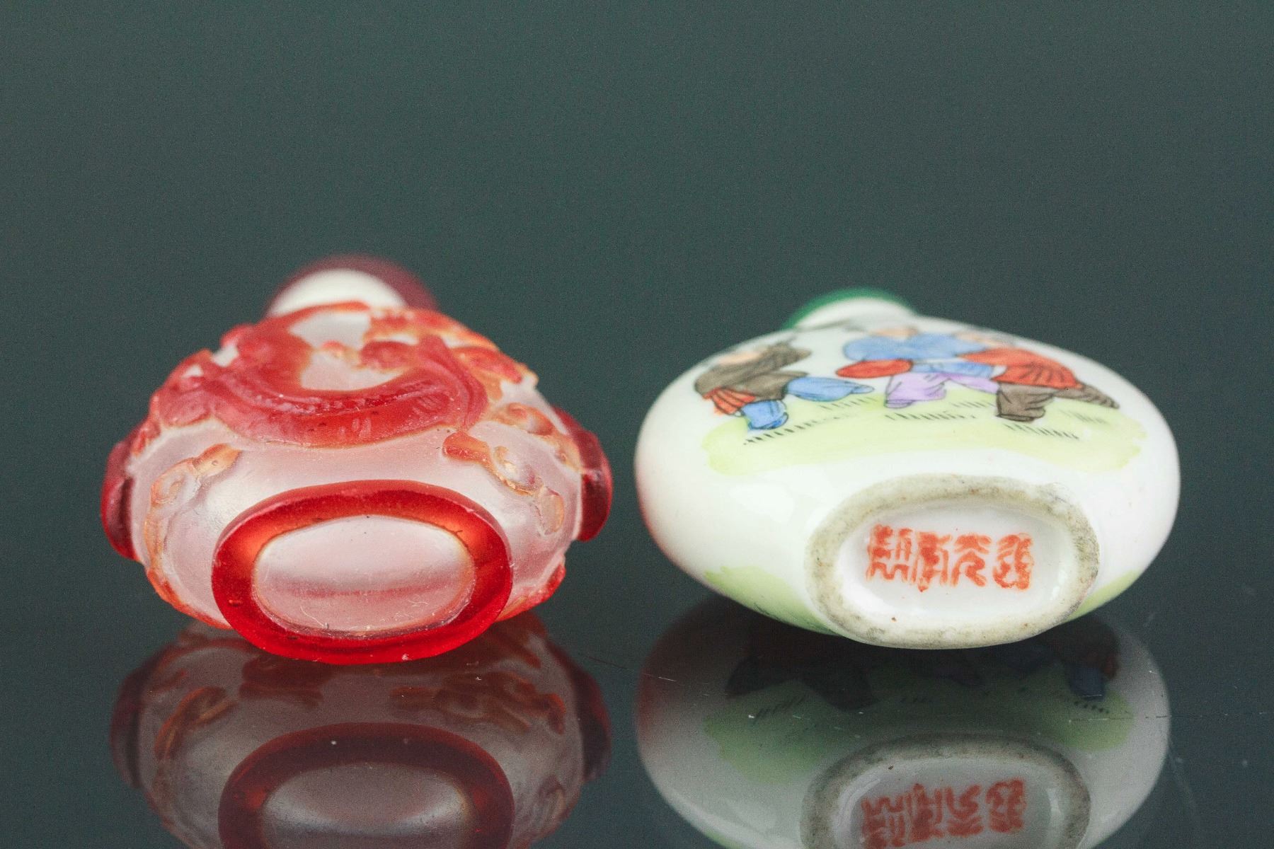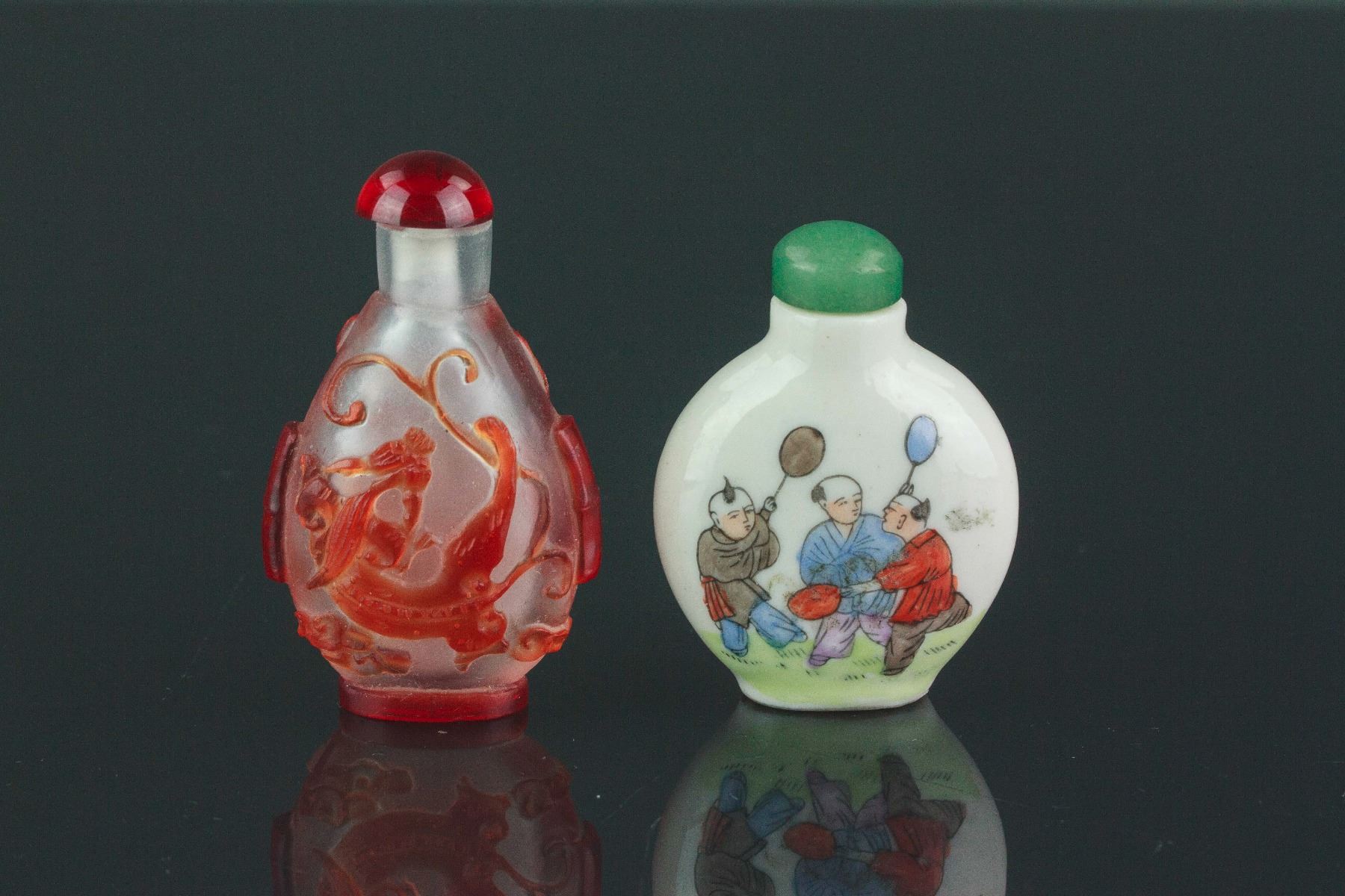 Two pieces of Chinese snuff bottles; one of Peking glass with low relief dragon carving; one of porcelain painted with playing boys; H: 6-7 cm, W: 2 cm, L: 4-4.5 cm, 89 grams total
