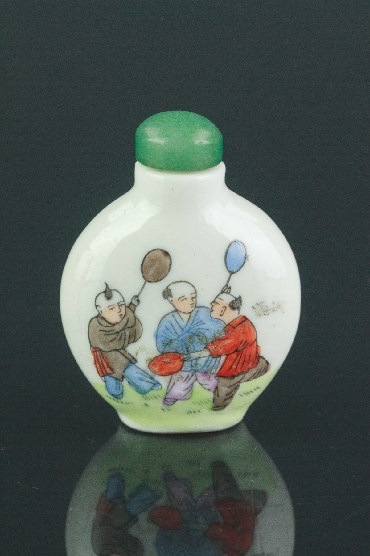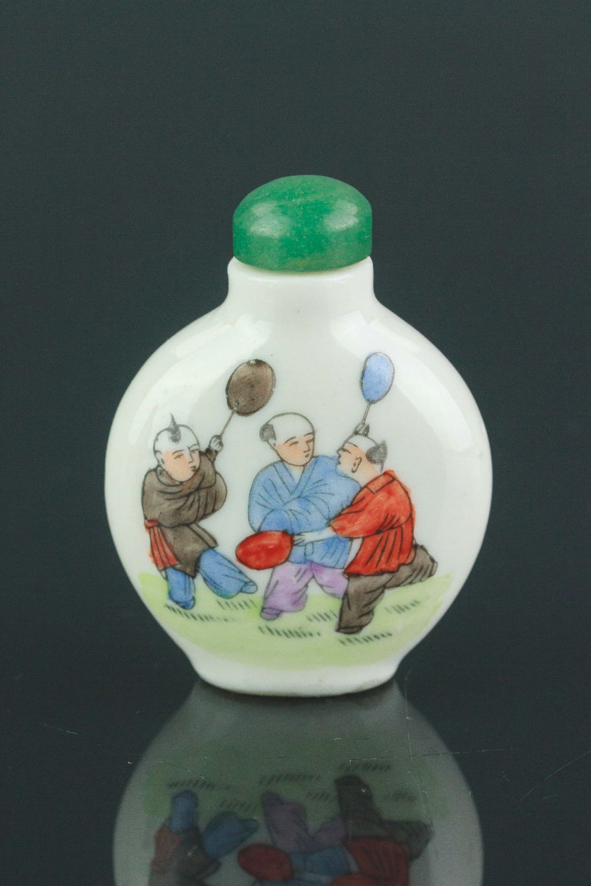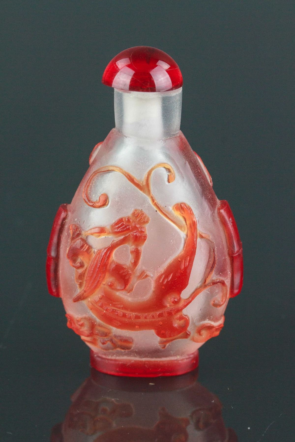 Two pieces of Chinese snuff bottles; one of Peking glass with low relief dragon carving; one of porcelain painted with playing boys; H: 6-7 cm, W: 2 cm, L: 4-4.5 cm, 89 grams total