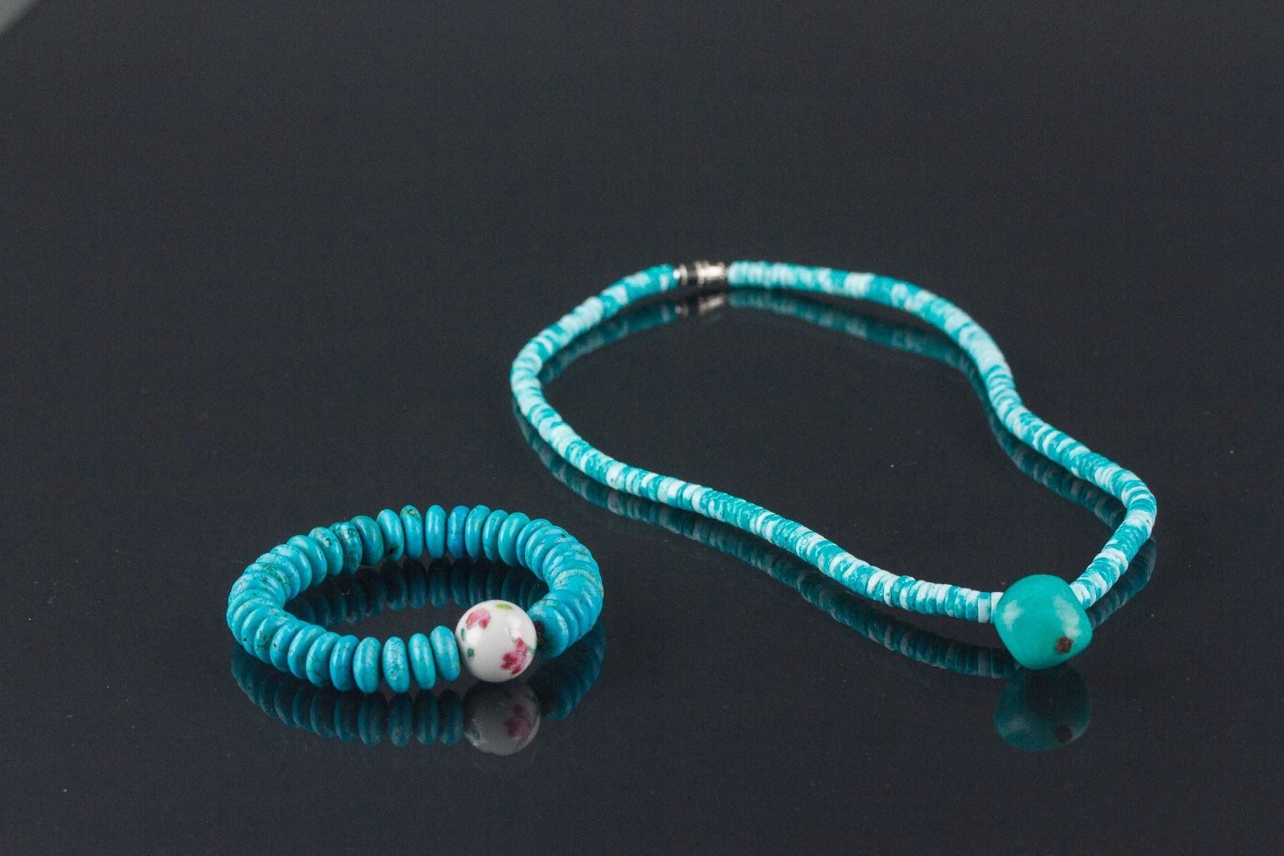 Two pieces of Chinese turquoise bracelet and necklace; bracelet comprised of round disk beads and one porcelain ball painted with flowers; necklace comprised of round disk beads and a natural shape pendant; D: 15.5 cm, 59 grams