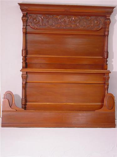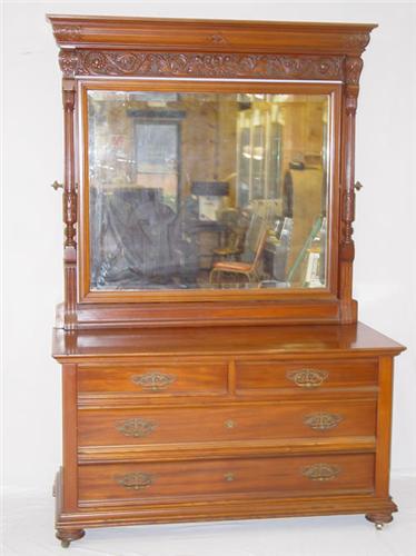 2 PC. HORNER BROS. (ATTRIBUTED) ROCOCO VICTORIAN BLACK WALNUT BEDROOM SUITE: (1) 2 OVER 2 DRAWER CHEST W/ MIRROR & (1) HIGH BACK BED-BOTH W/ CARVED FOLIATE DEVICES IN A STIPPLED BACKGROUND - WEAR & IMPERFECTIONS