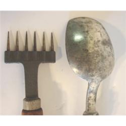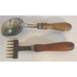 2 PIECE LOT OF WOODEN HANDLED UTENSILS. Consists of one ice cream scoop (10.5" L) and one 6 pronged utensil (9.25" L).