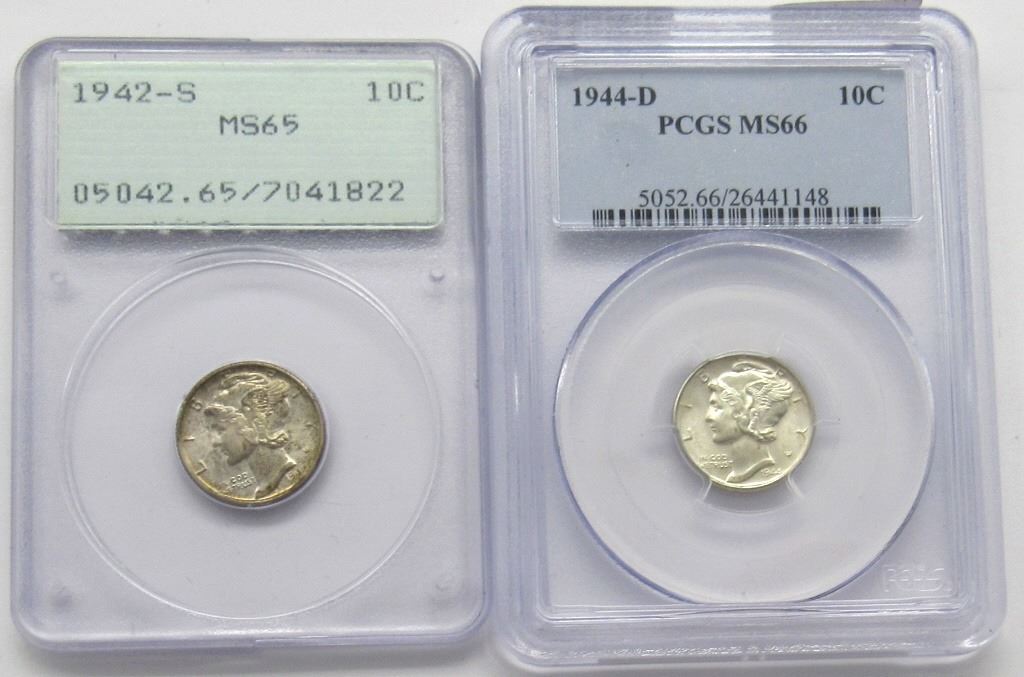 1942-S MS65 Old holder, 1944-D MS66 10C