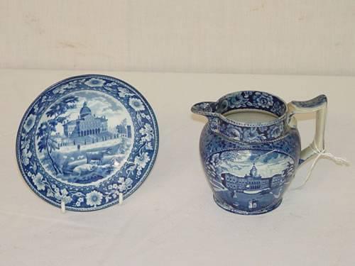 (2) PCS. OF BLUE STAFFORDSHIRE W/ THE BOSTON MA STATE HOUSE: 5 3/4" SAUCER & 4 1/4" CREAM JUG - BOTH W/ DAMAGE & LOSSES;