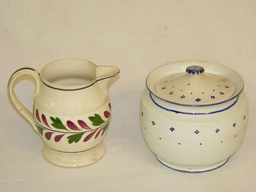 (2) PCS. OF EARLY SOFT PASTE CHINA: (1) 5" PEARLWARE SUGAR BOWL W/ BLUE DOTS & LINES- 1/3" CHIP ON LID EDGE & (1) 4 1/2" STAFFORDSHIRE CREAMER W/ RED & GREEN LEAFY DECORATION W/ BLACK LINES-EDGE WEAR, STAINING, IMPERFECTIONS