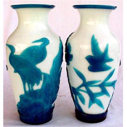 <tr><td>Title:2 PEKING CAMEO GLASS VASE CRANES DOVE FLOWERS</td></tr>
