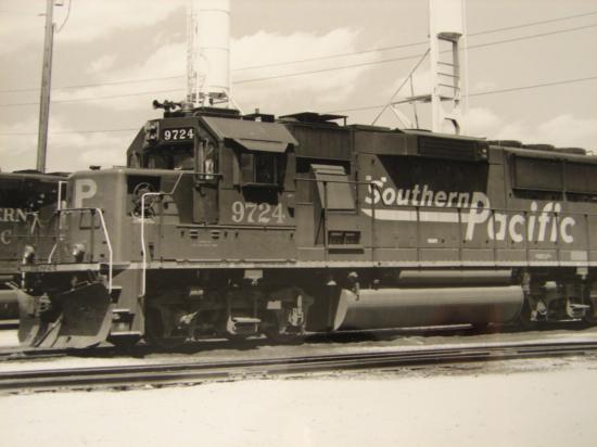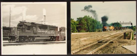 Here are two vintage photographs of Southern Pacific locomotives, which include clip-frames. One is a color photo while the other is black and white. A unique addition to any Southern Pacific railway collection!