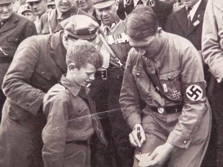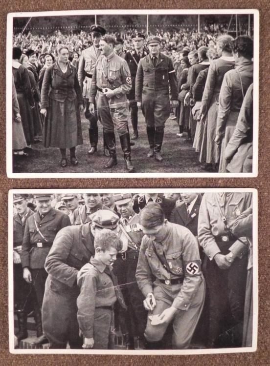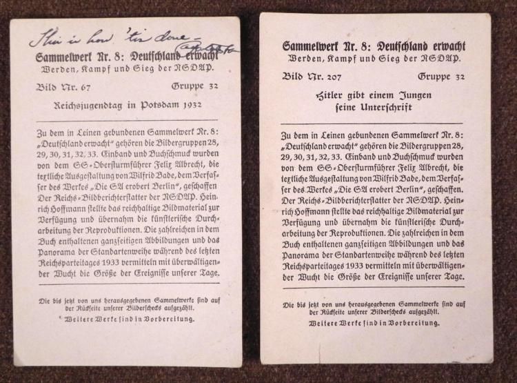 TWO PHOTOS OF HITLER WITH STORY IN GERMAN ON BACK-NOTATION FROM GI" ALSO3X5--FROM CIG CARD ALBUM--GI NOTE ""THIS IS HOW TIS DONE"""