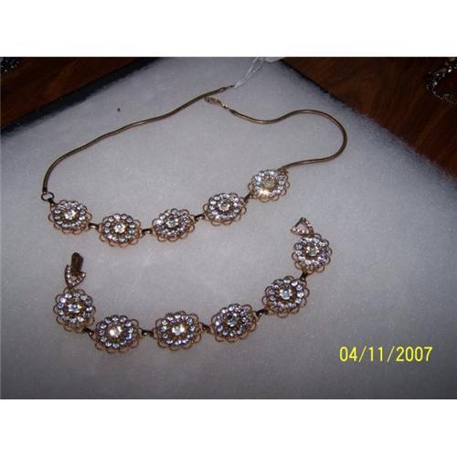 Up for sale is a 2-piece Demi Parure Rhinestone Necklace with matching Bracelet. Both are in excellent condition. There are no missing or discolored stones. If you would like additional pictures or have questions, please feel free and do not hesitate to contact me. I am here to help you in any way I can. The necklace is 17 ¾? long and the bracelet is 7 ½? long.