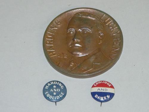 (2) POLITICAL CAMPAIGN PINBACK BUTTONS FROM THE 1920'S: (1) 7/8" HARDING & COOLIDGE (CIRCA 1920) & (1) 7/8" COOLIDGE & DAWES (CIRCA 1924), ALONG W/ A 2 3/4" 1921 HARDING LUCKY SOUVENIR PENNY OF WASHINGTON DC 188. LOT (11) LEATHER POSTCARDS CIRCA 1900-19