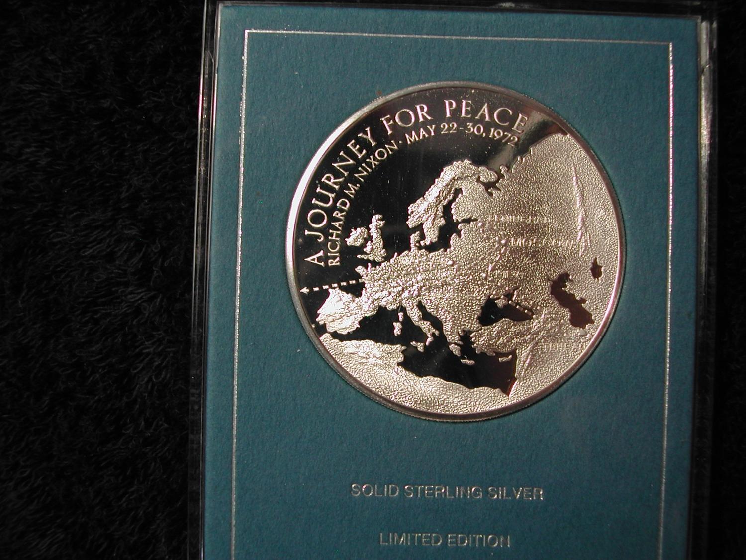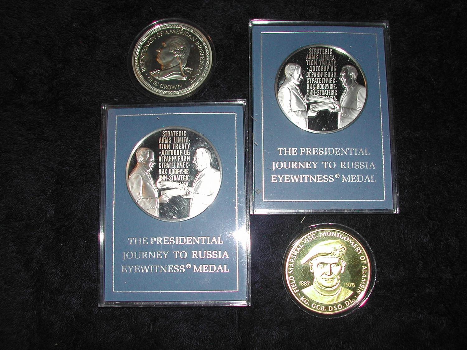 2 POPJOY MINT SURRY ENGLAND COMMEMORATIVE COINS, 2 STERLING NIXON RUSSIAN MEDALS