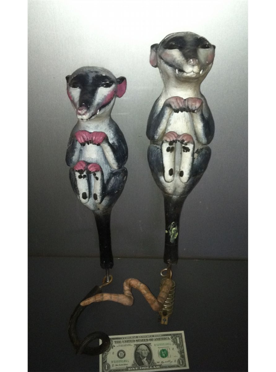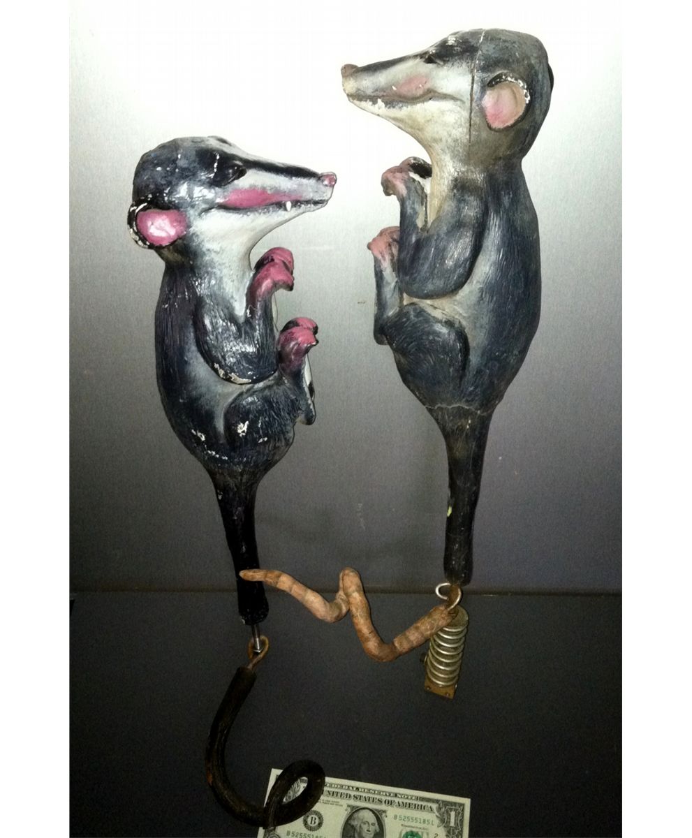 Offered here are two nicely sculpted and painted possum figures with some mechanical parts and a spring attached to one of them that used to make them bounce up and down. One is complete with tail section. The other has a half tail. Possibly used in a Disneyland ride or display at some time based on origin.