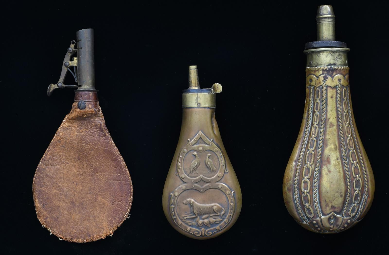 1) SKYES PATENT BRASS ADJUSTABLE POWDER FLASK. Overall: 8". CONDITION: brass has pleasing mustard patina w/ numerous dents. 2) POWDER FLASK. Overall: 6". Flask has motifs of resting setter & 2 pheasants. CONDITION: good overall w/ pleasing mustard patina, area of light verdigris & large dent that pierced body. 3) LEATHER SHOT BAG. Overall: 7.5". CONDITION: brass spout has dark patina. Shot bag has fair appearance w/ repaired stitching along bottom portion of seam. (02-19825/MD). $150-200.