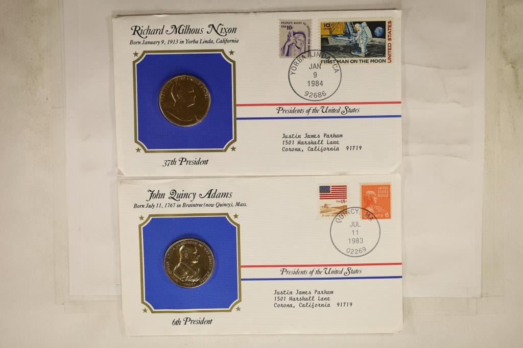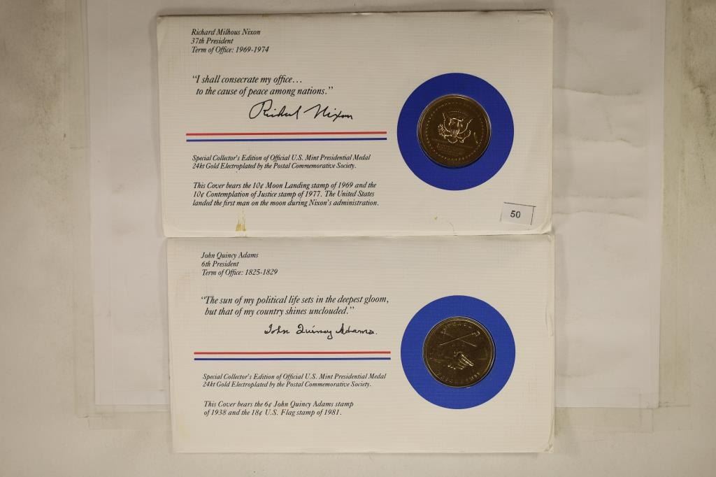 ENVELOPES WITH CANCELLED STAMP AND 1 1/2" MEDAL ROUND: 1983 6TH PRESIDENT JOHN QUINCY ADAMS & 1984 37TH PRESIDENT RICHARD MILHOUS NIXON DONE IN 24KT GOLD ELECTROPLATING