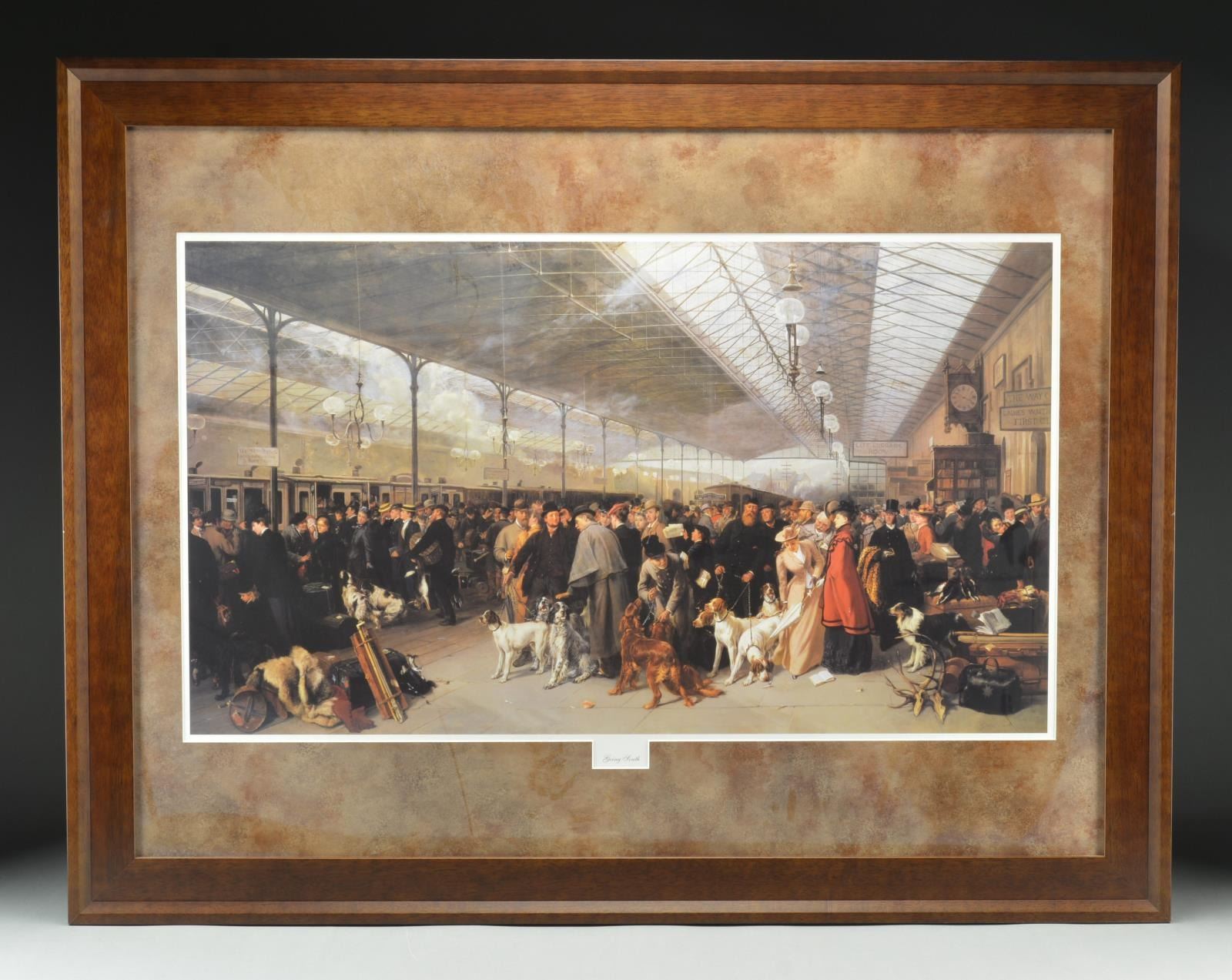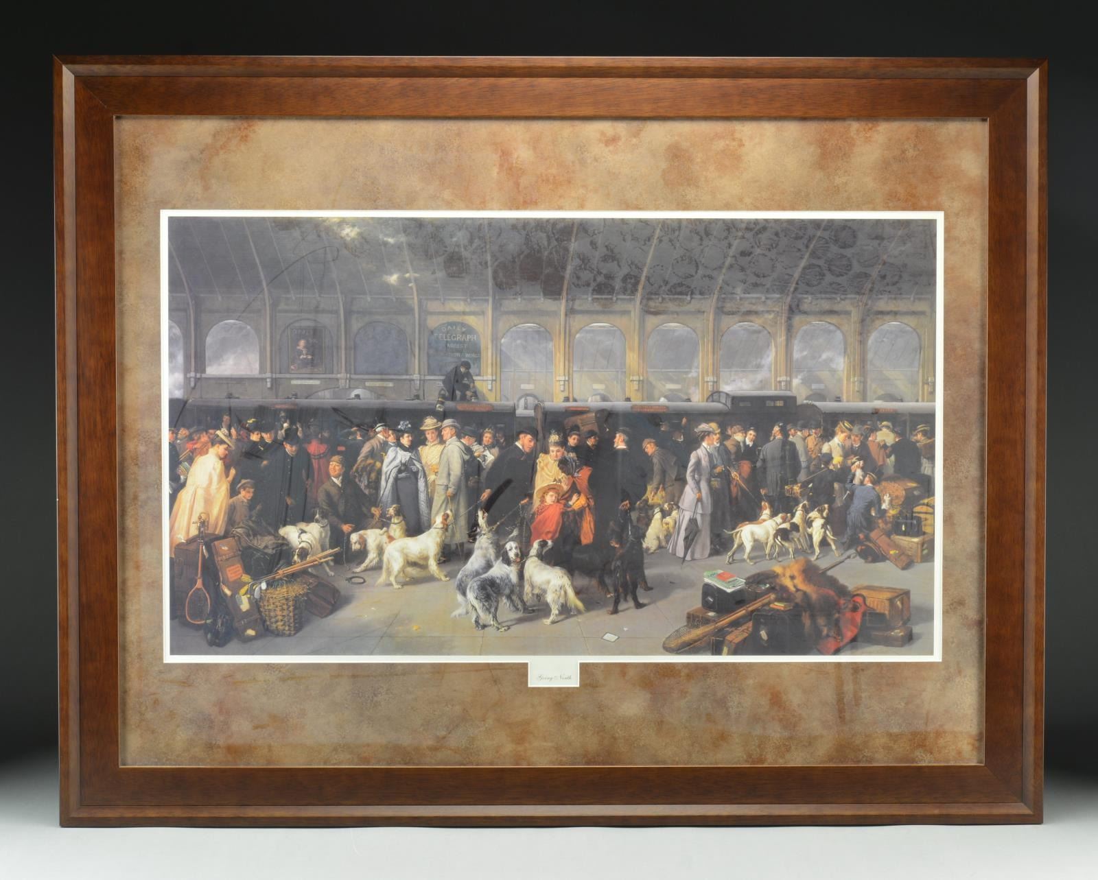 2 framed prints. 36" high & 45" wide depicting rail passengers departing at station. Appearance of late 1800s to very early 1900s. CONDITION: very good to excellent. PROVENANCE: From the Collection of Thomas B. & Freeda Harper Jr. (02-16557/NW). $500-800.