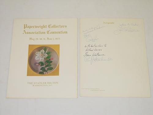(2) PROGRAMS FOR PAPERWEIGHT COLLECTORS ASSOCIATION CONVENTION DATED MAY/JUNE 1975-STATLER HILTON, WASHINGTON DC-(1) W/ 8 AUTOGRAPHS OF PAPERWEIGHT MAKERS - GOOD CONDITION