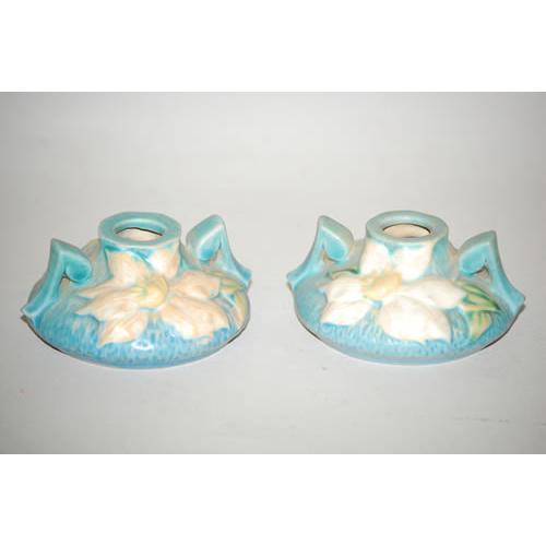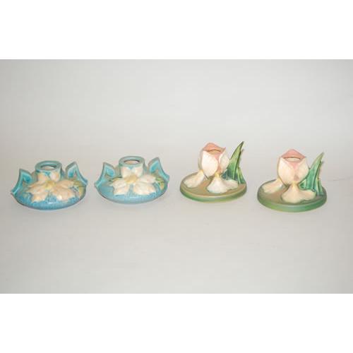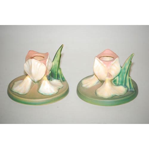 (2) PRS. ROSEVILLE POTTERY LOW CANDLESTICKS - (1) PR.<BR>BLUE CLEMATIS PATTERN CANDLESTICKS #1158-2 & (1) PR.<BR>IRIS PATTERN CANDLESTICKS #1134 (HIGHEST TIP OF FLOWER<BR>BROKEN OFF & REPAIRED) - BOTH W/ MINOR WEAR & CRAZING