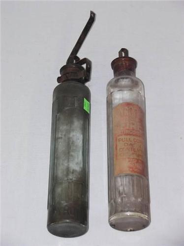 (2) PYROFITE FLUID GLASS FIRE EXTINGUISHERS W/ CONTENTS: (1) W/ PAPER LABEL, (1) W/ BRACKET;