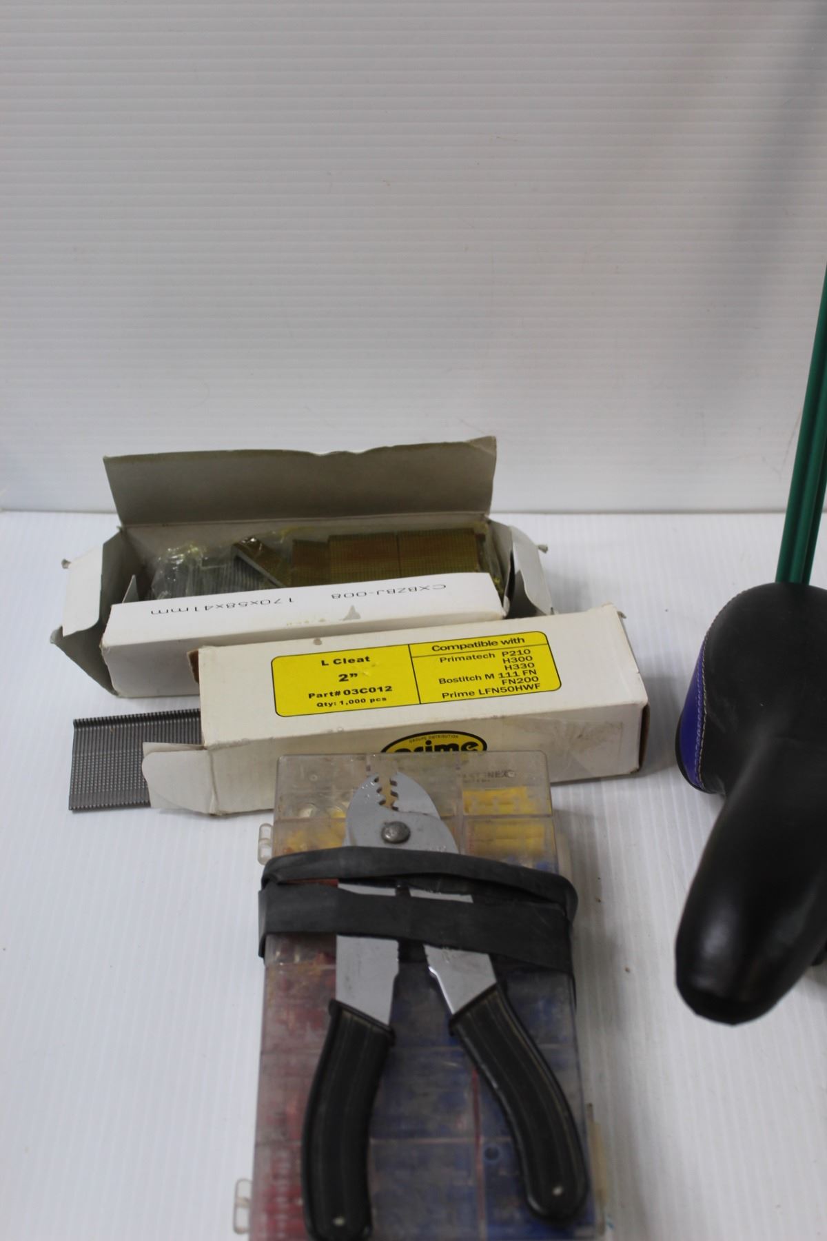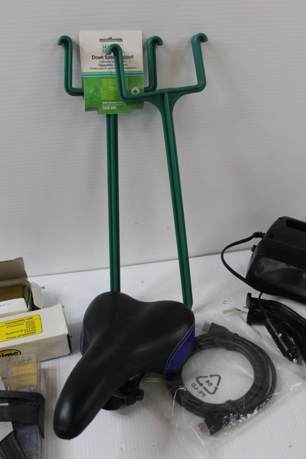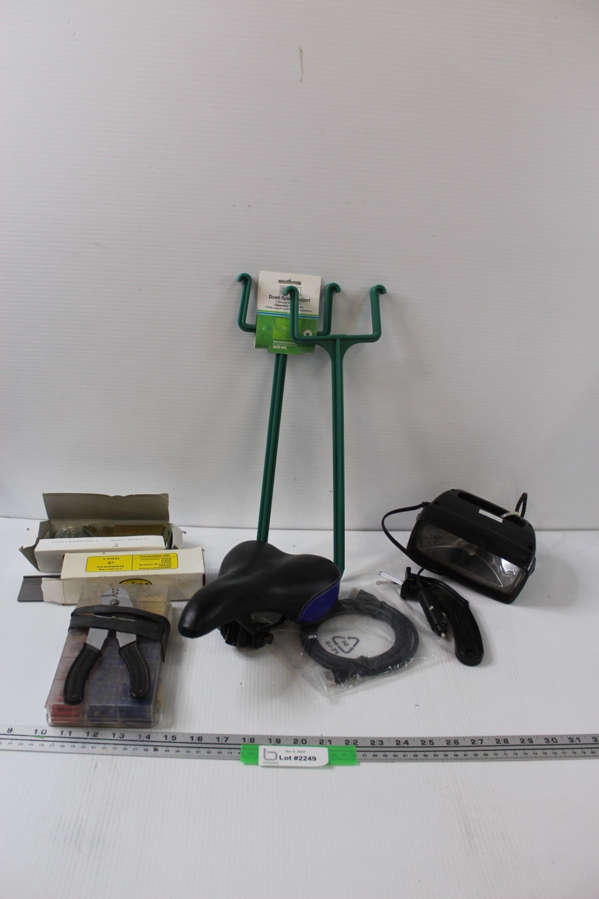 (2) Package of 'L' Cleat Nails, (2) Down Spout Supports, Bicycle Seat, 12v Plug in Light - as is, Mi