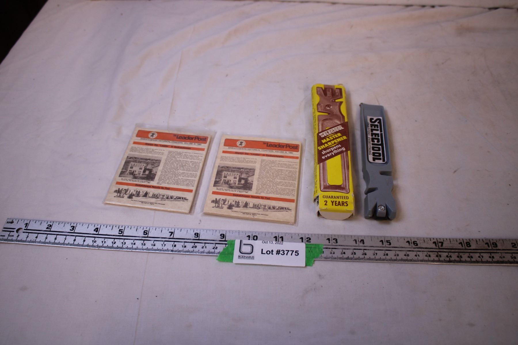 (2) Packages of 1980 Saskatchewan Historical Coasters + 1950’s Tool Sharpener/Glass Cutter w/ Box and Instructions ("like new")