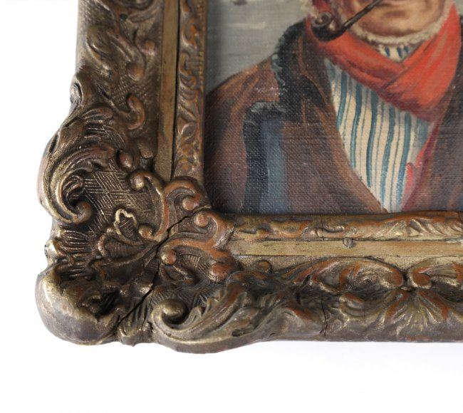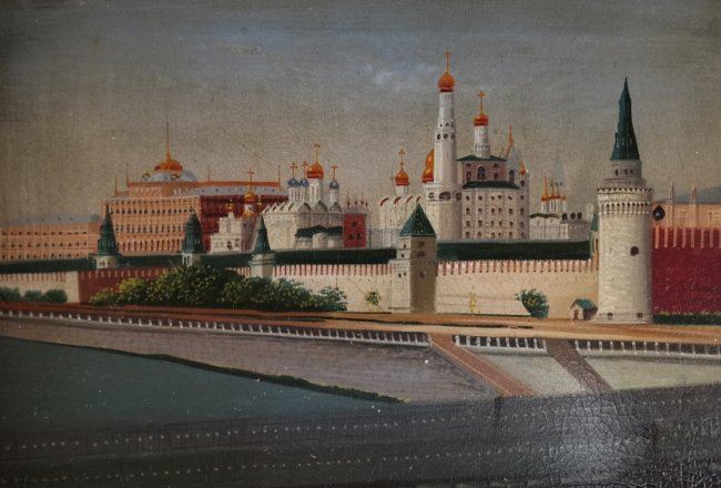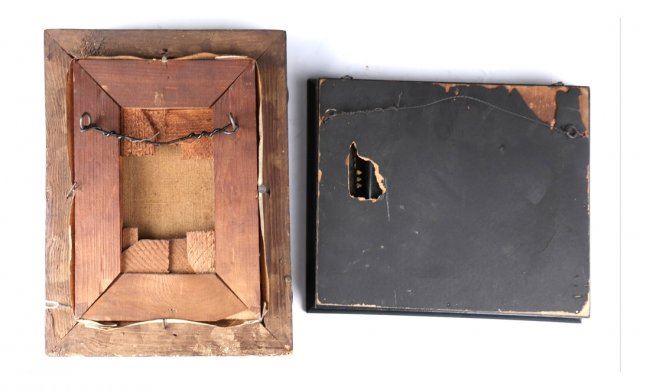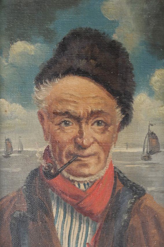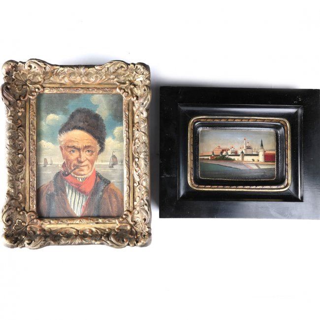 1) Small portrait of an old man with ships, oil on canvas. [Sight: 6 1/2" H x 4 1/2" W; Frame: 9 1/4" H x 7 1/4" W]. Minor surface grime. 2) Russian city scene painting on a tin dish. [Sight: 4 1/4" H x 6" W; 7 1/4" H x 9" W]. In good condition.
