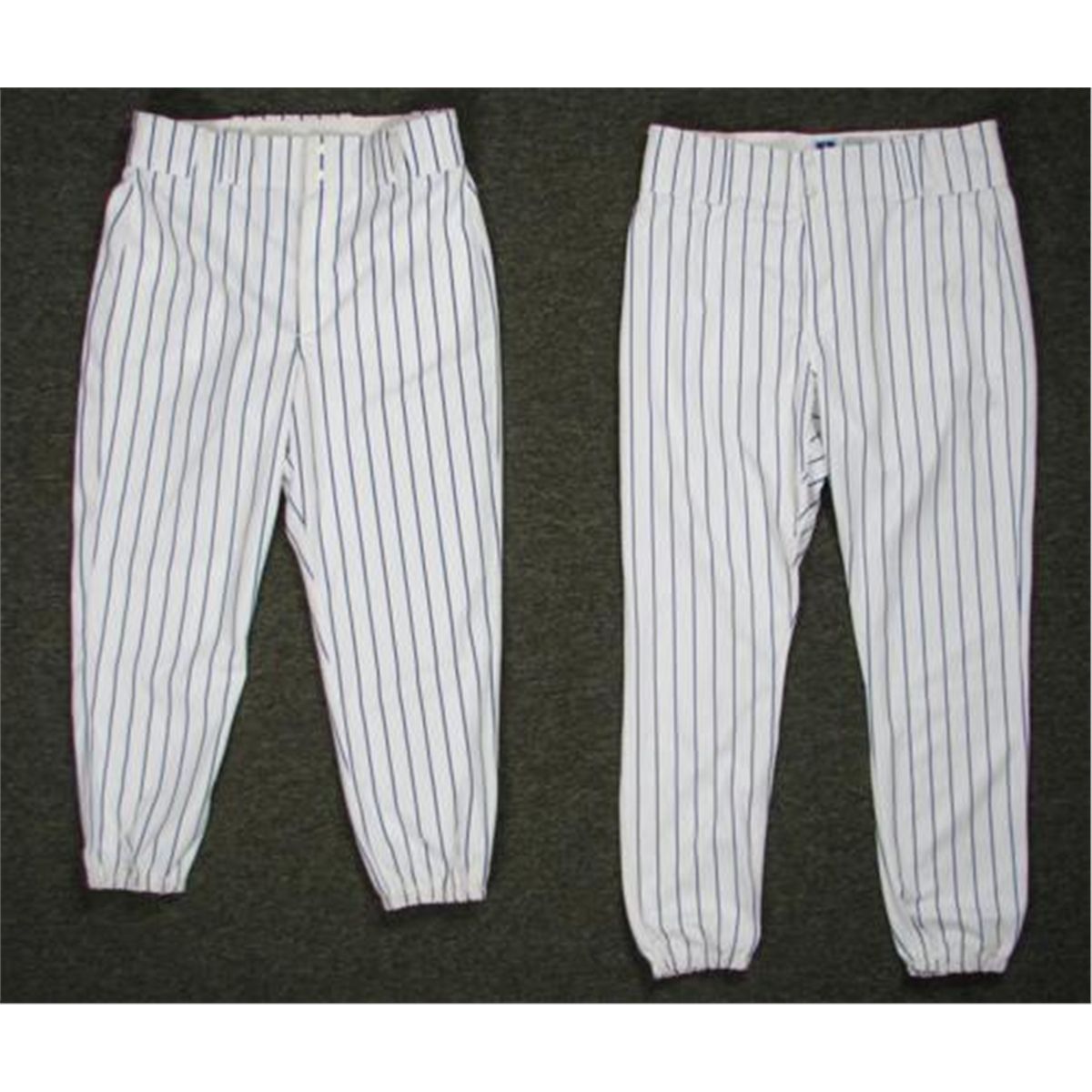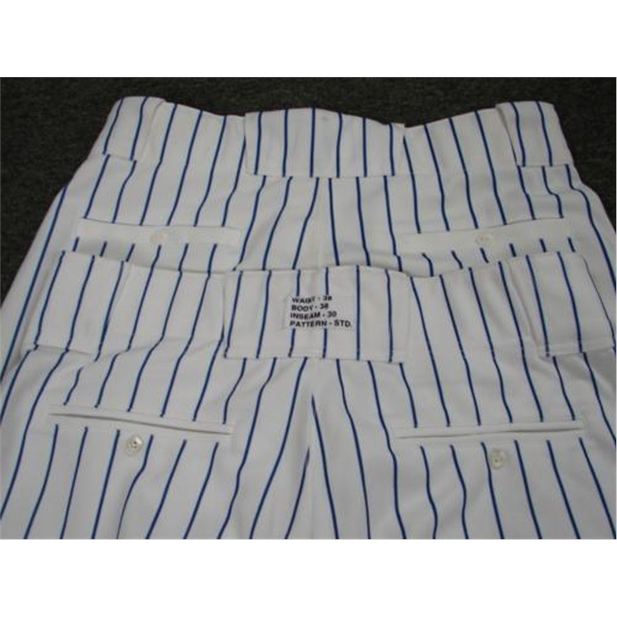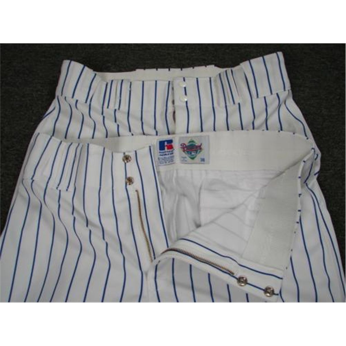 Here are three pairs of baseball pants that are exactly like those used by Major League teams during professional games. They were made by Russell Athletic. They are classic white and navy pinstripes in all polyester, with double snap and zippered front, and elastic waist. They are in Very Good condition, with a few slight stains or smudges. One pair is a size 38. * The other pair has the size marked on a patch on the back side, as follows: * Waist - 38 Body - 38 Inseam - 30 * These will be great for a collection, for display, or put on a pair yourself and wear proudly, just like the pros. These high quality, authentic style pants are being offered here at a fraction of their original retail value.