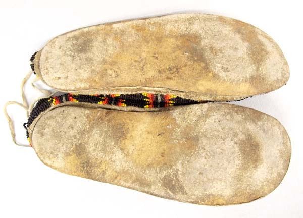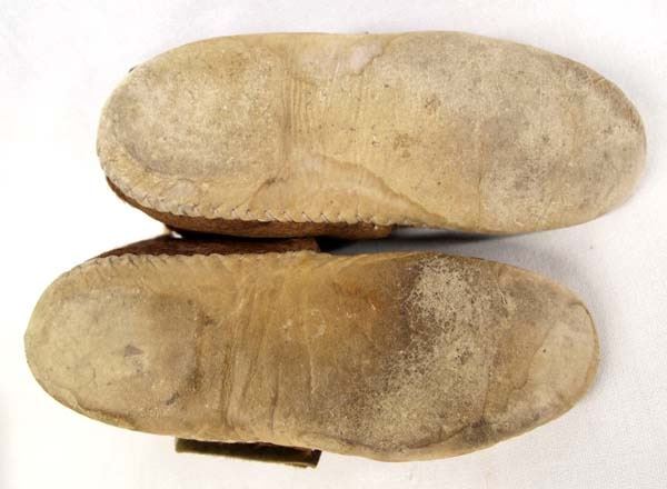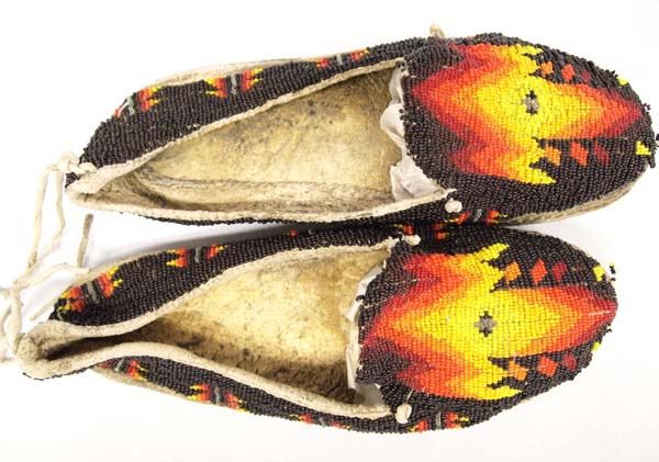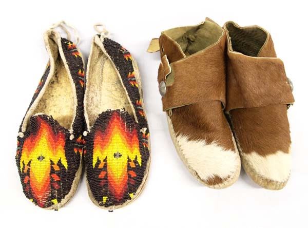 2 Pair of Native American Moccasins, longest measures 11'' end to end x 4''W, one is hand beaded and the other is brown and white cowhide with conchos