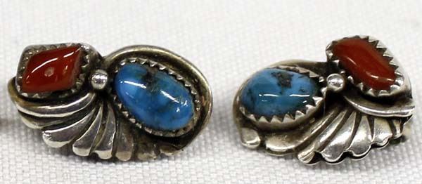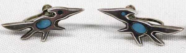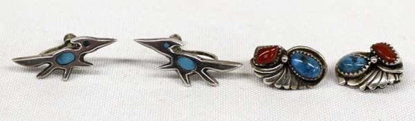 2 Pair of Vintage Native American Navajo Earrings, roadrunners measure 1''L and are screwbacks, the turquoise and coral ones are clip-ons