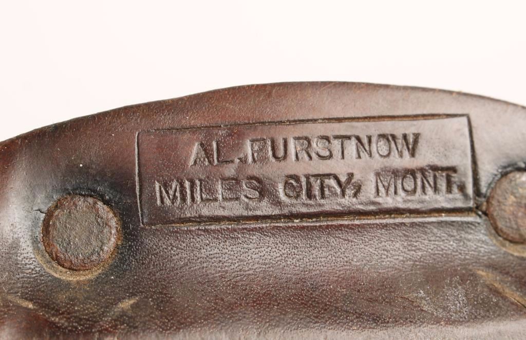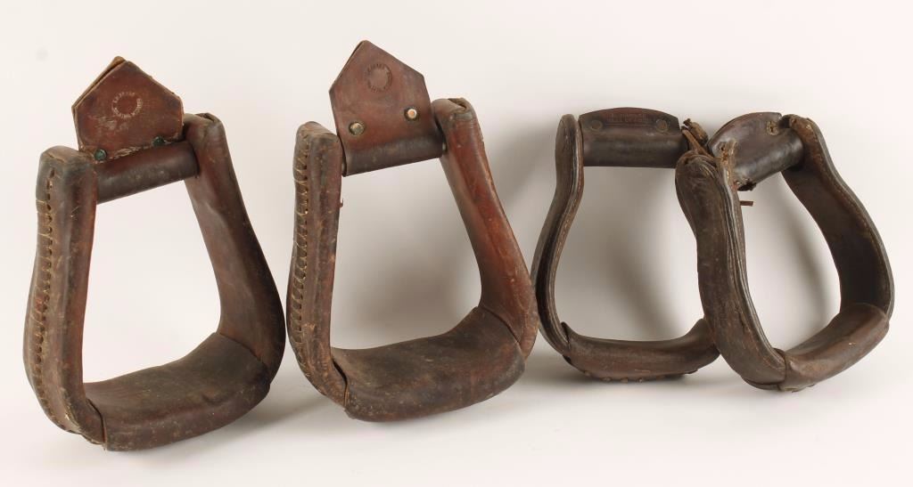 Early type that are wrapped in leather one of which is maker marked 'Al Furstnow, Miles City, MT' and other is marked 'LH Brand, Galveston, WY'.