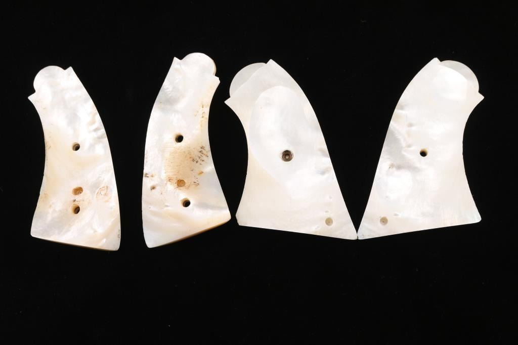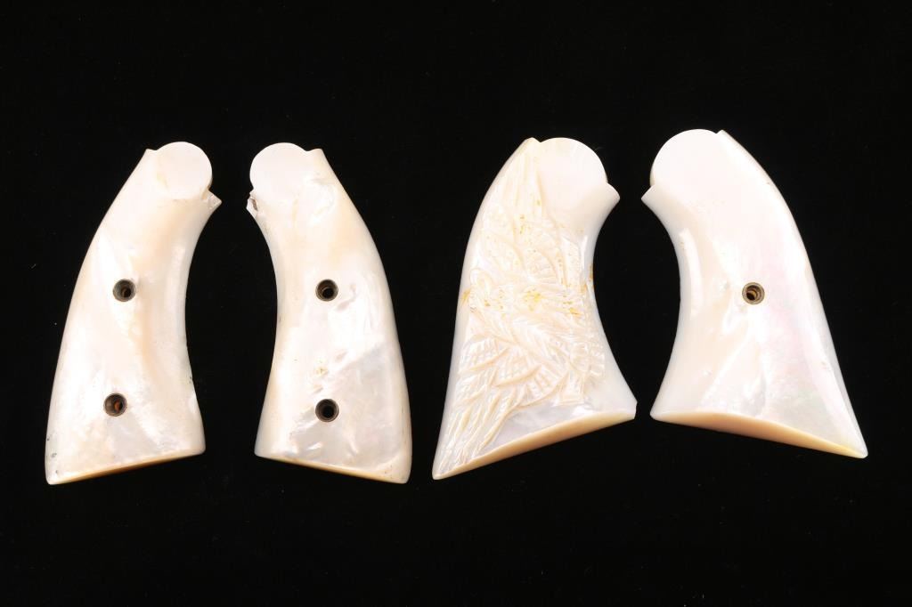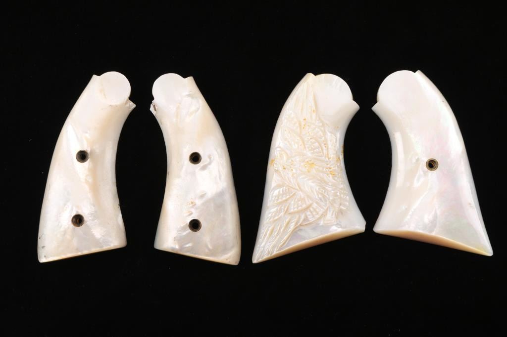 Both of high quality, appearing to be for Colt or Smith & Wesson revolvers. Set #1, large frame with carved eagle on the right panel. Very good condition with small loss to the toe on the right panel. Set #2, medium frame with provisions for double fasteners. Good condition with small losses.