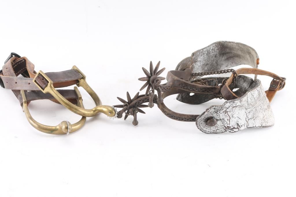 1- Spanish or California style spurs in iron w/ darkened silver or German silver inlay. Rusted w/ deteriorated leathers.