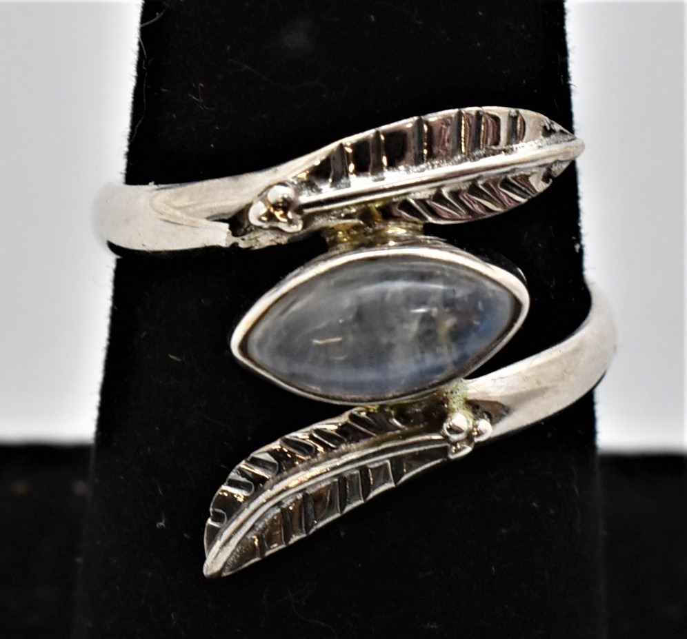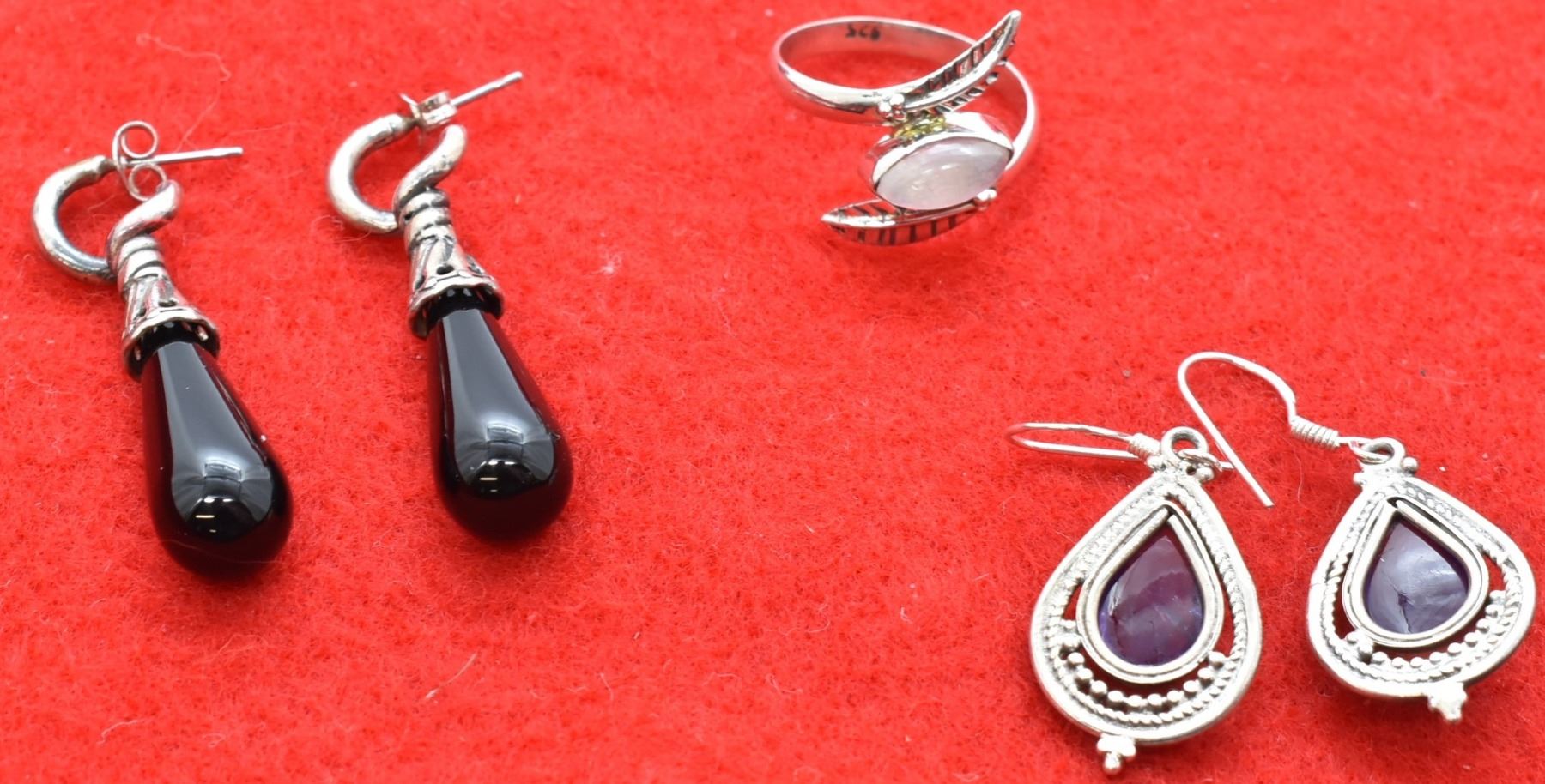 2 Pairs of Sterling Earrings and 1 Sterling Ring, includes 1. Vintage Mexican Sterling Onyx Earrings, longest measuring 1.5'' 2. Sterling Moonstone Ring, Size 7.5 3. Sterling Amethyst Earrings