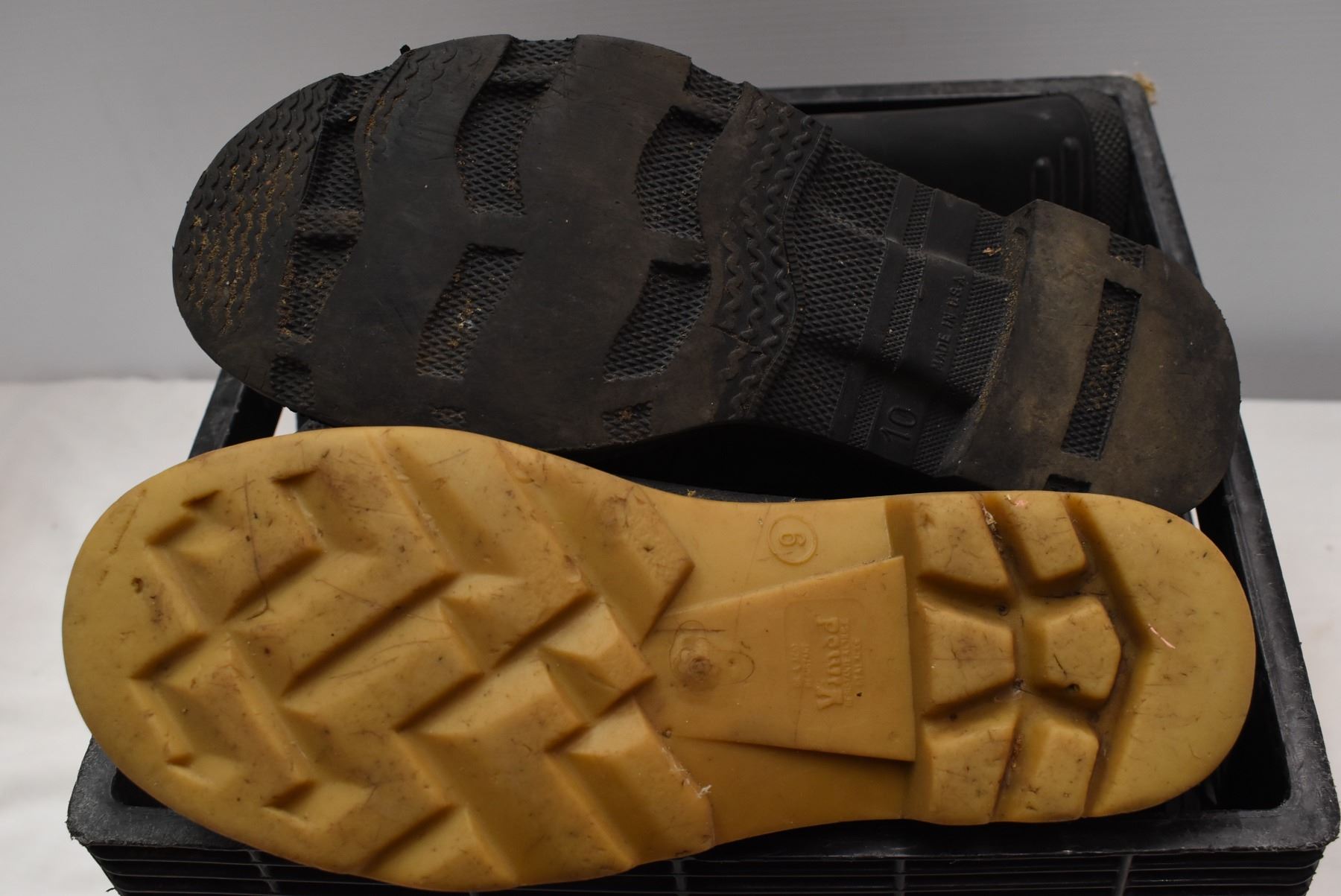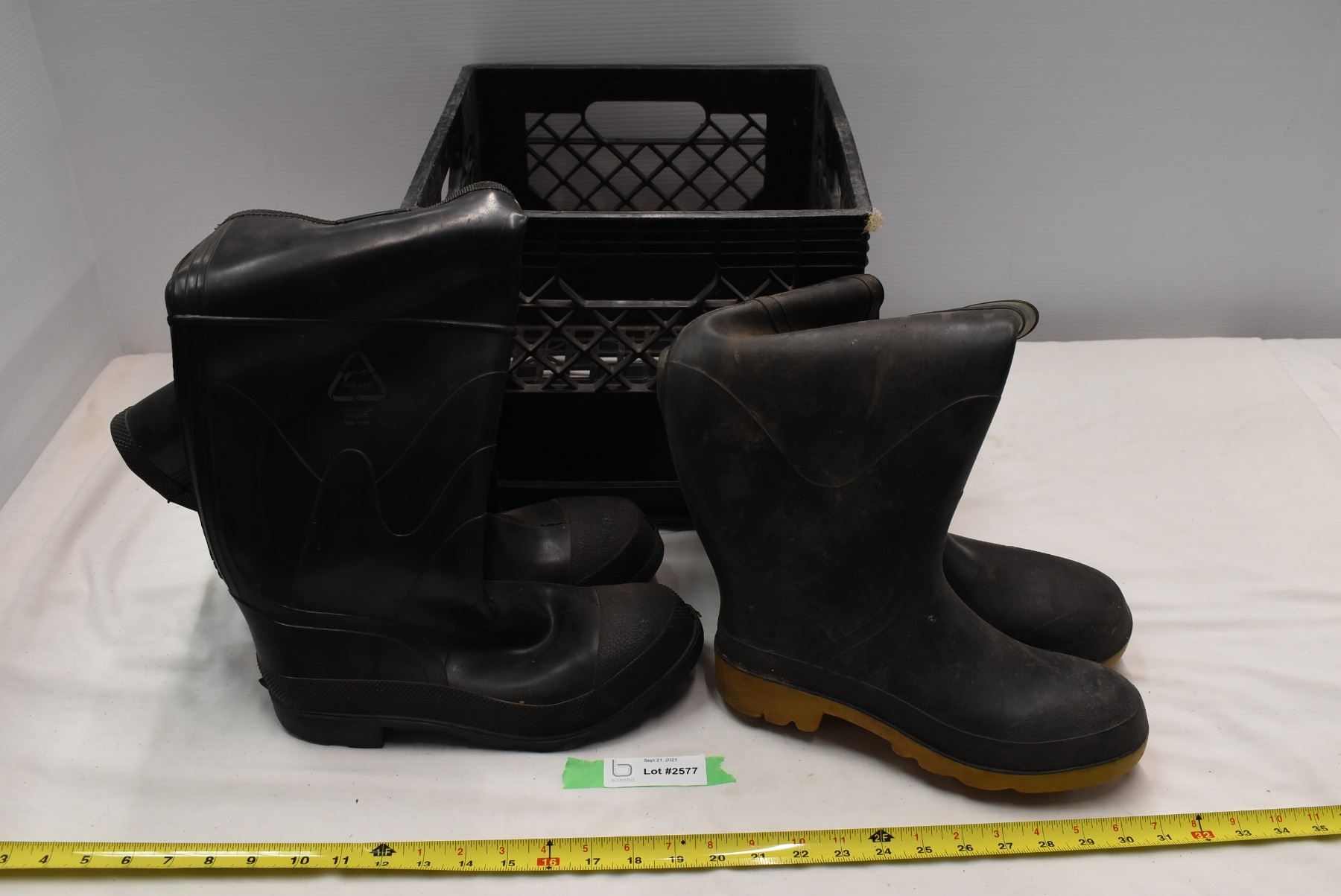 2 Pairs of rubber boots, size 10 & 9. Black milk crate included