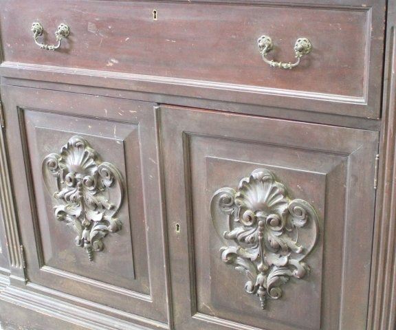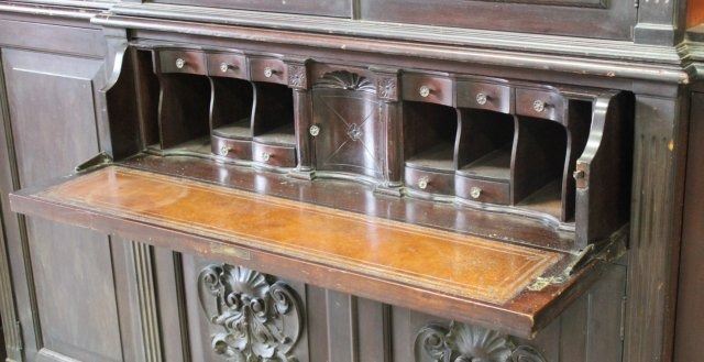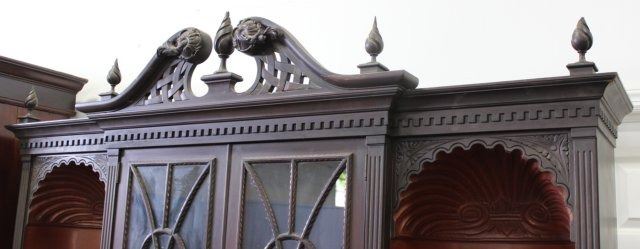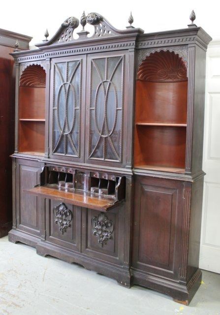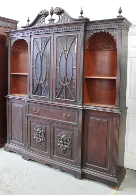 Full interior. Shell carving. Broken arch pediment. With carved top. Approx. 89" H x 78" W x 15 1/4" D.