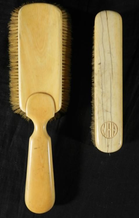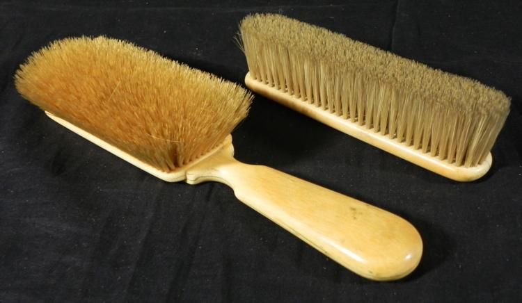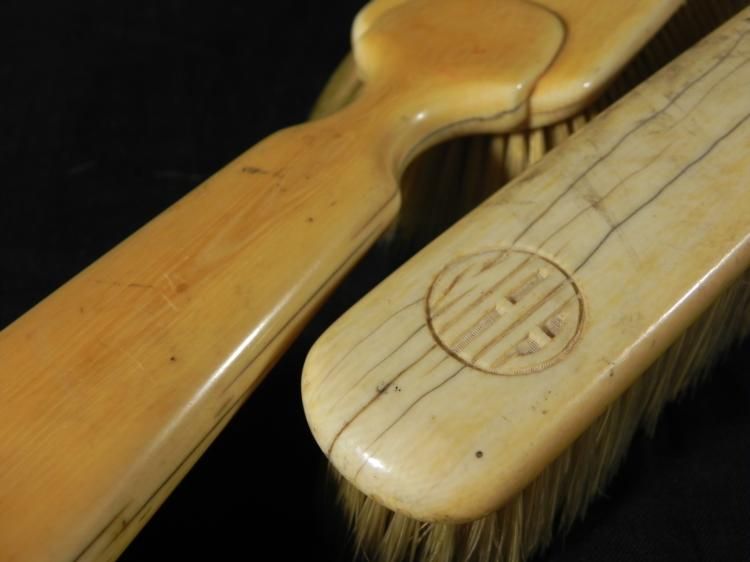 This is a two piece group of antique ivory handle brushes, possibly made for polishing. One is a large brush with long handle, and its condition is very good. The other brush has a monogram carved onto the top, with initials MAH. Its condition is good, with some cracking. The bristles on both brushes are very good and clean. The brush sizes are 6 1/2 and 10 inches long. * * These are fine ivory brushes for collectors, and nice to display on a dresser to table.