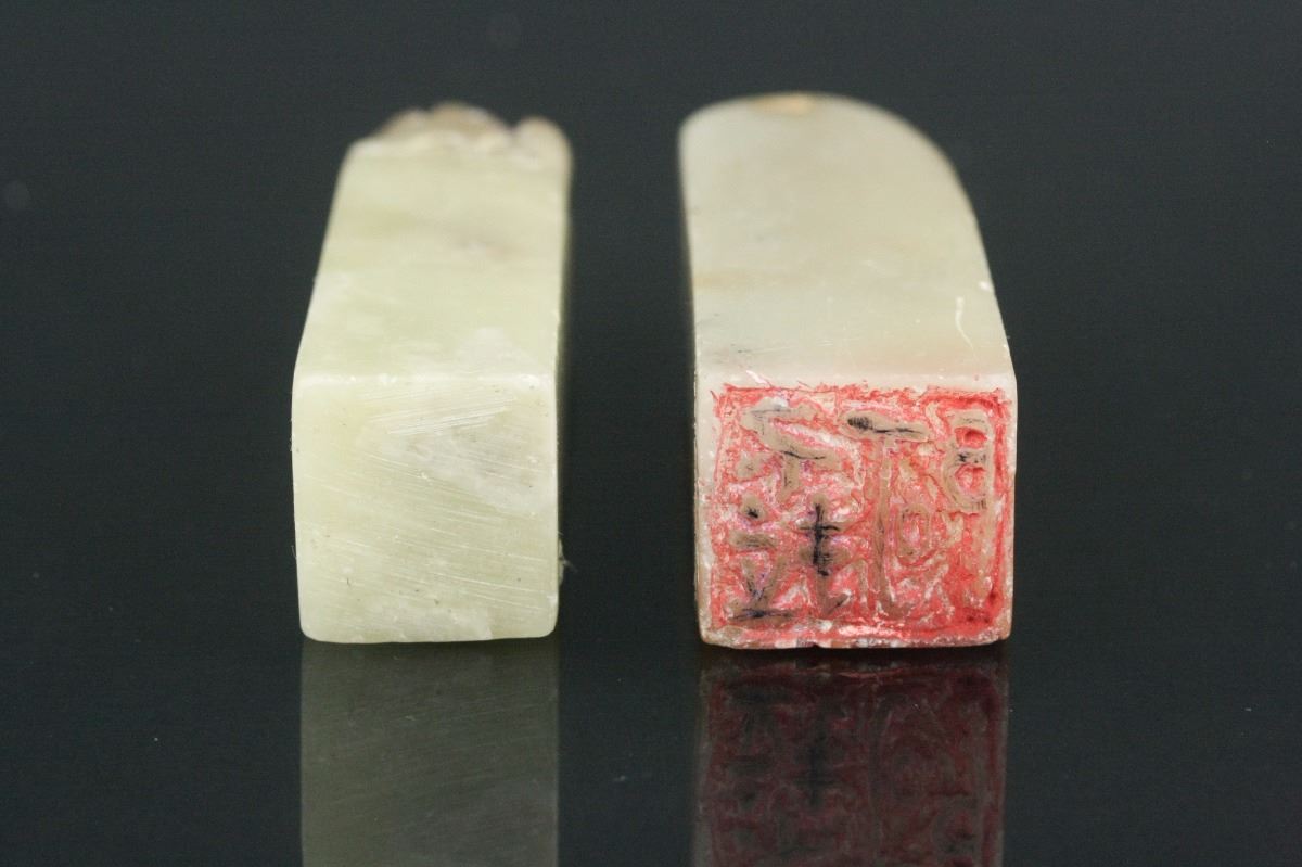 Two pieces of Fulong Shoushan stone seals; surmounted by perching cranes; one seal with uncarved base; H: 6 cm, W: 2 cm, 80 grams total